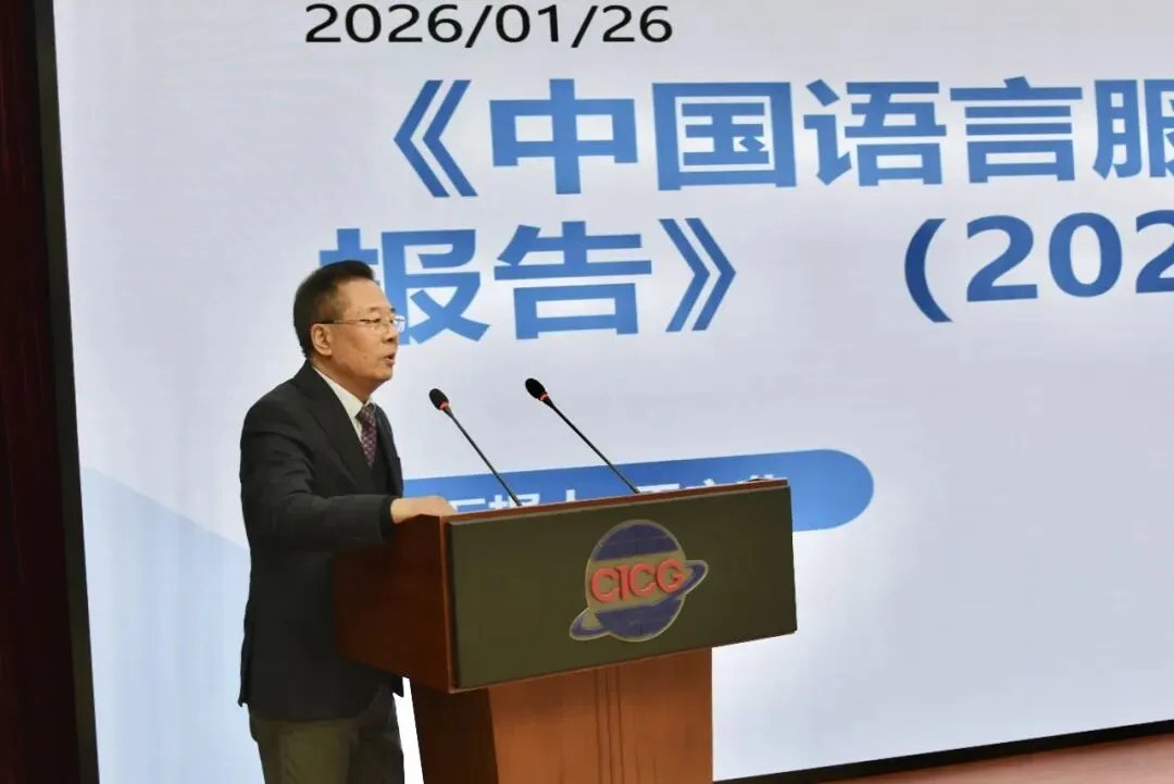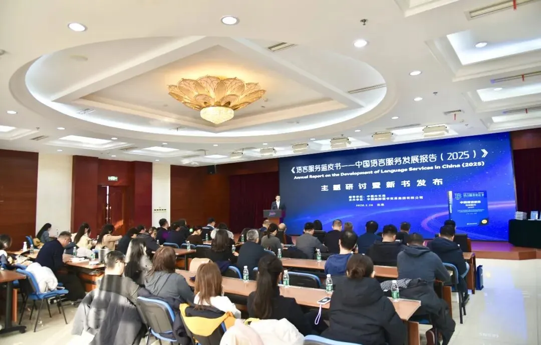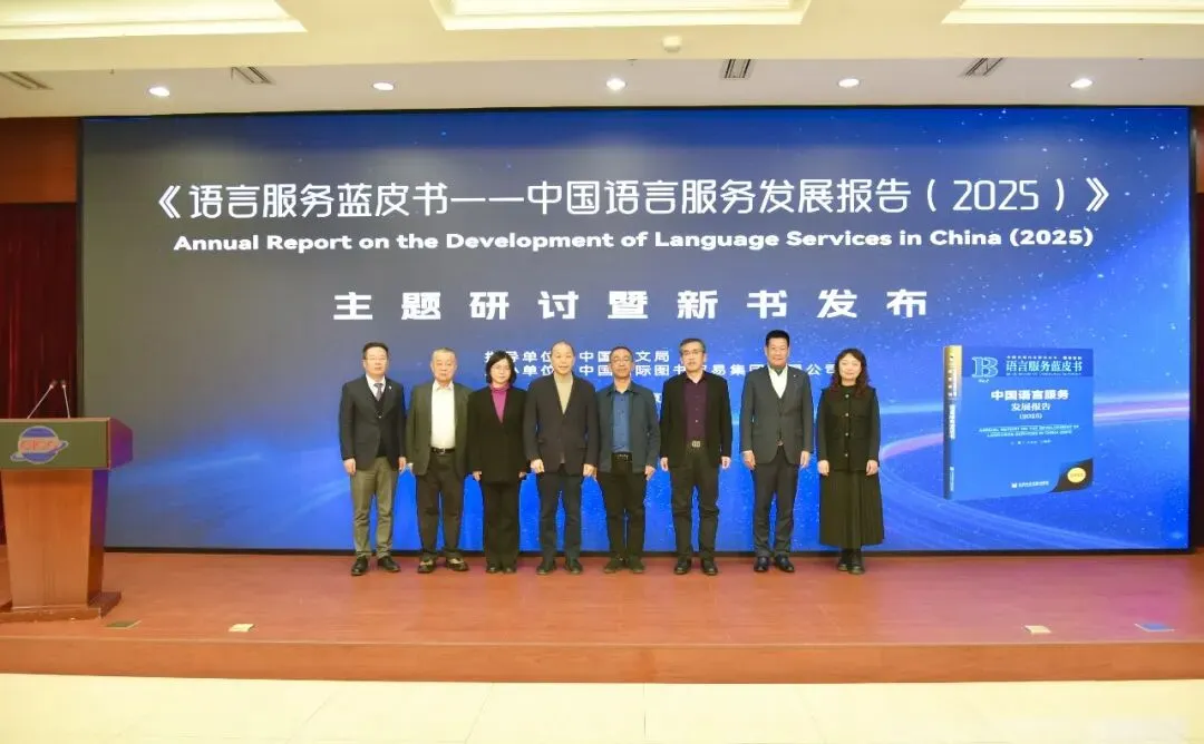 1月26日,由中国外文局指导、中国国际图书贸易集团公司(以下简称国图集团)主办的《语言服务蓝皮书——中国语言服务发展报告(2025)》(以下简称《语言服务蓝皮书(2025)》)主题研讨暨新书发布在京举办。中国外文局副局长谢刚、商务部服务贸易和商贸服务业司二级巡视员(副司级)朱光耀、教育部语言文字应用管理司二级巡视员周道娟、中国外文局计划财务部副主任杨秀端等有关部门领导,北京语言大学教授、澳门中西创新学院副校长、《语言服务蓝皮书(2025)》主编王立非,澳门中西创新学院校长、报告编委会主任仲伟合,中国出版协会副理事长、新译研究院院长谢寿光等业界嘉宾,以及语言服务院校代表,首批特色服务出口基地(语言服务)代表等40余位嘉宾出席活动。国图集团副总经理、国际传播科技文化园管委会主任高晓强主持活动。