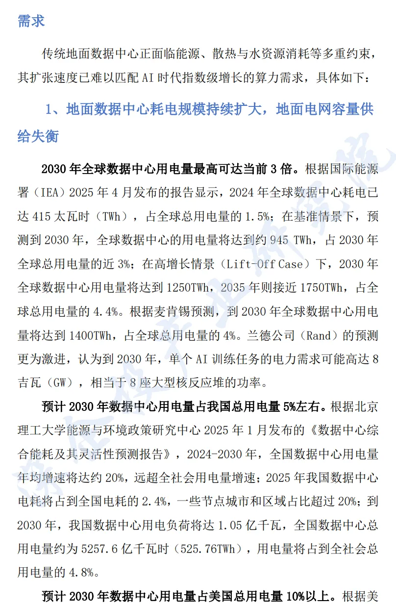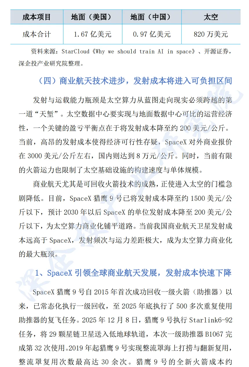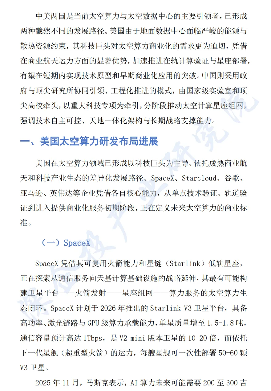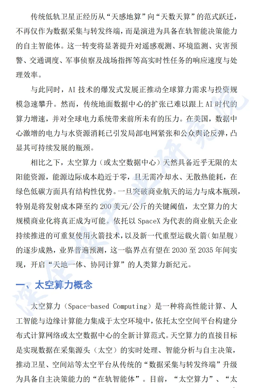 太空算力是商业航天与AI技术融合催生的新一代计算范式,其核心在于推动卫星从“天感地算”的数据采集终端,升级为具备在轨实时处理与智能决策能力的“天数天算”自主平台,并最终迈向“天地一体协同计算”。其发展根本驱动力在于,AI爆发式增长引发的全球算力需求,已使传统地面数据中心面临电力供给失衡、散热能耗与水资源消耗的巨大瓶颈;而太空凭借近乎无限的太阳能与宇宙深冷的零水耗散热环境,具备长期运营的结构性成本优势。当前,商业化落地的关键前提在于将发射成本降至约200美元/公斤这一临界点,业界预计随着SpaceX星舰等可重复使用重型火箭技术的成熟,该拐点有望在2030-2035年间实现。目前中美形成差异化发展路径:美国由科技巨头主导,依托成熟商业航天生态加速在轨验证与早期商业化;中国则以国家级实验室与地方政府协同引领,通过重大工程专项体系化推进。尽管面临太空能源、高可靠元器件、热管理、高速通信及在轨运维等系列工程技术挑战,但其总体突破路径已相对明确。【引用说明】:本文源自网络,版权归原作者所有,助力大家开展相关研究需要。