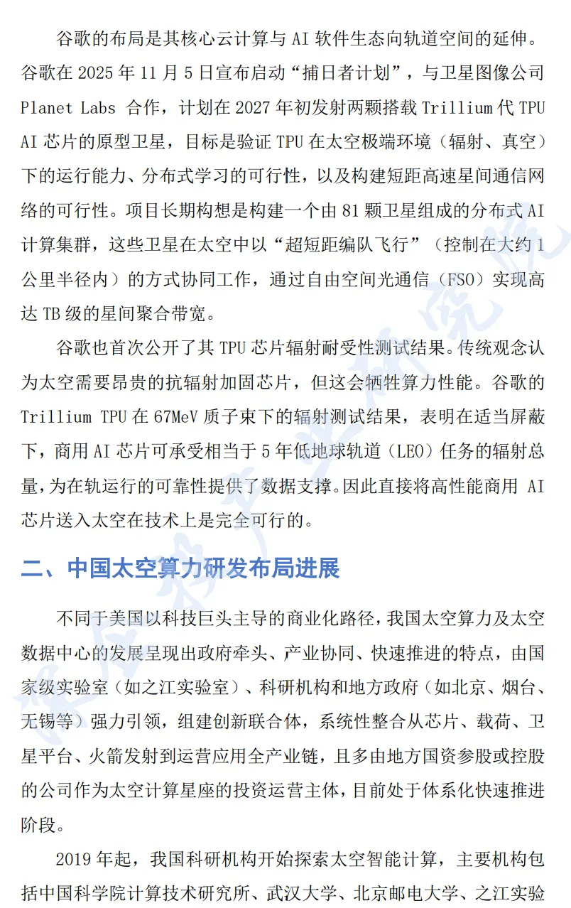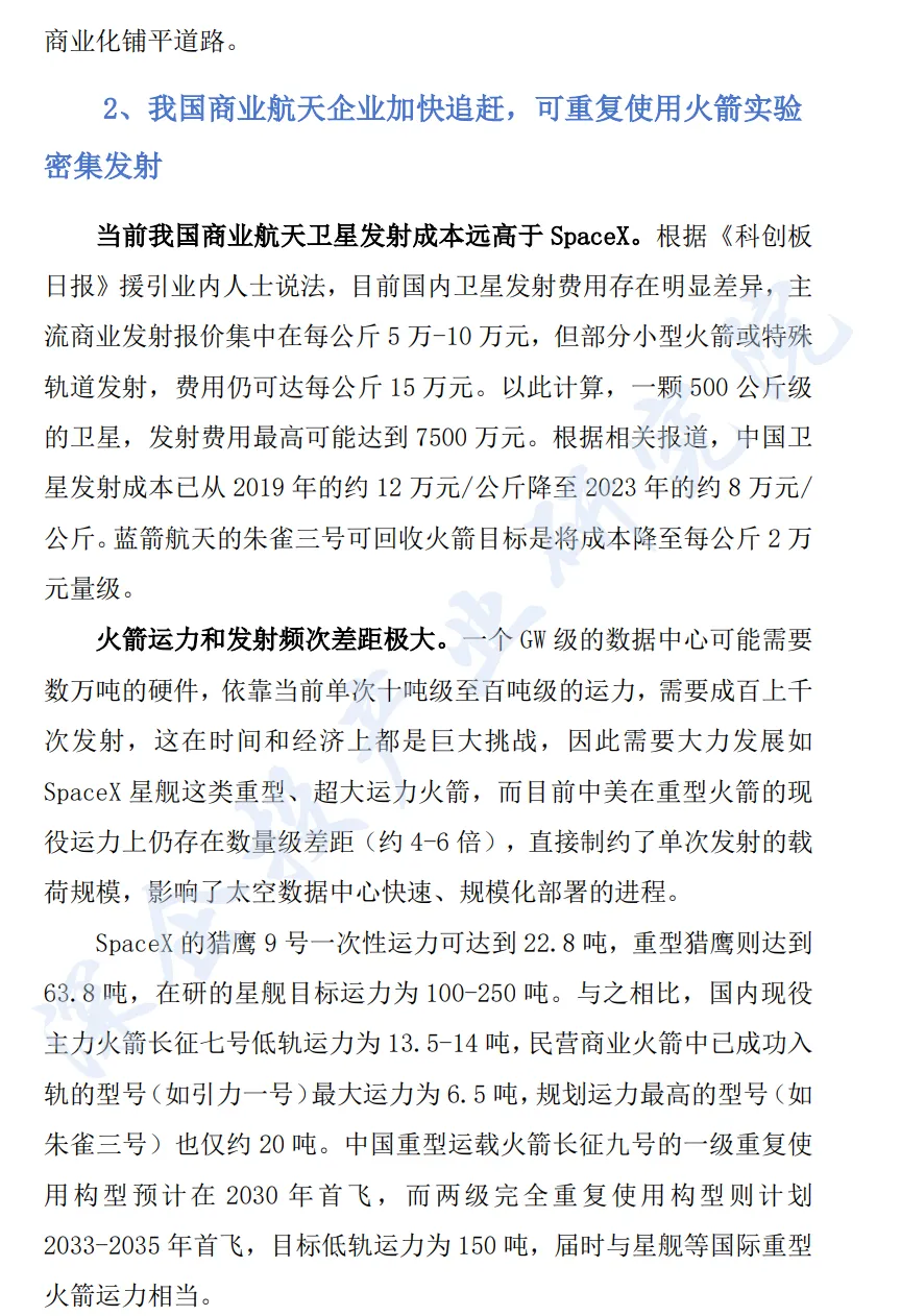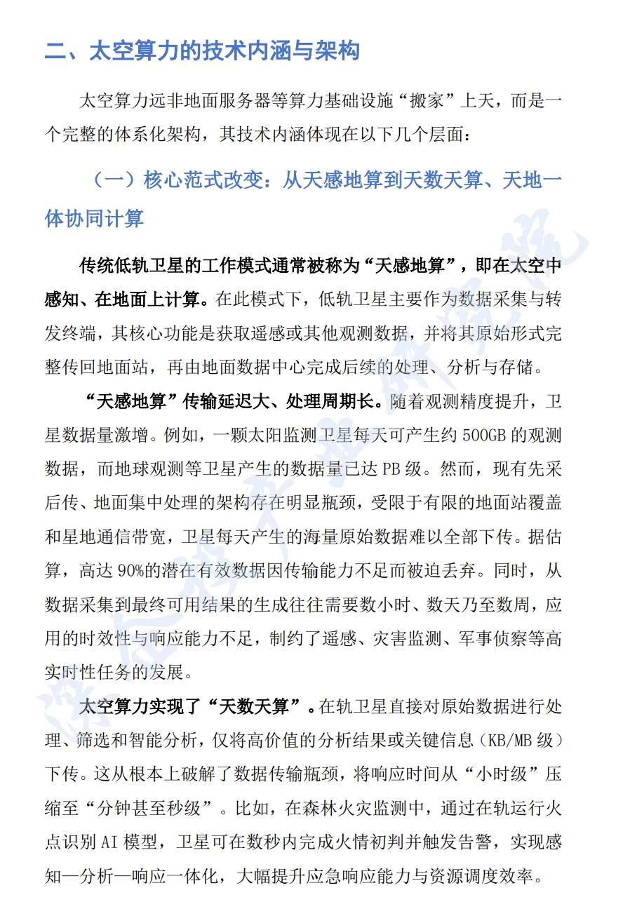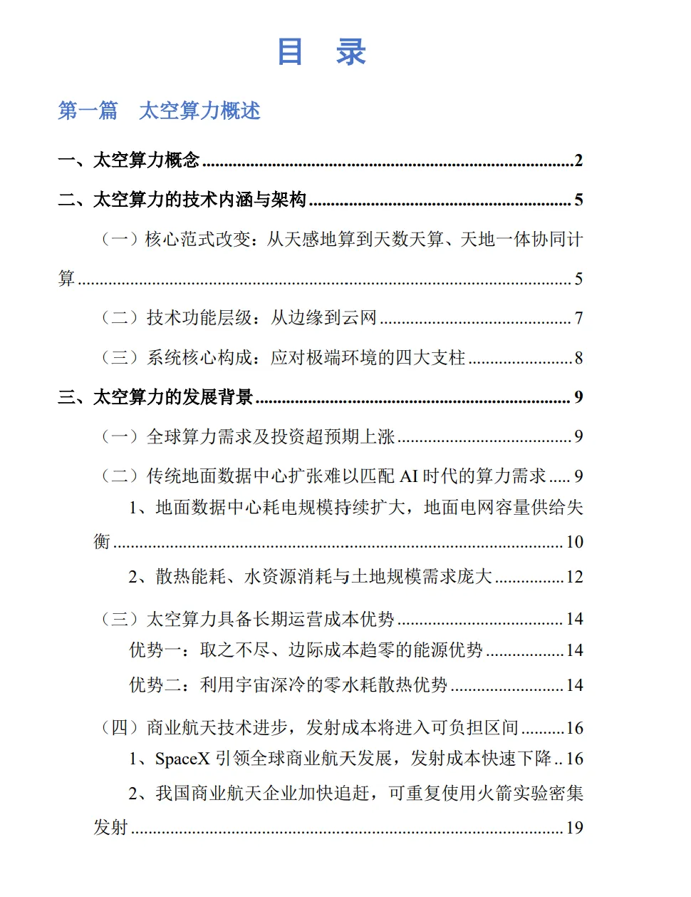 太空算力是商业航天与AI技术融合催生的新一代计算范式,其核心在于推动卫星从“天感地算”的数据采集终端,升级为具备在轨实时处理与智能决策能力的“天数天算”自主平台,并最终迈向“天地一体协同计算”。其发展根本驱动力在于,AI爆发式增长引发的全球算力需求,已使传统地面数据中心面临电力供给失衡、散热能耗与水资源消耗的巨大瓶颈;而太空凭借近乎无限的太阳能与宇宙深冷的零水耗散热环境,具备长期运营的结构性成本优势。当前,商业化落地的关键前提在于将发射成本降至约200美元/公斤这一临界点,业界预计随着SpaceX星舰等可重复使用重型火箭技术的成熟,该拐点有望在2030-2035年间实现。目前中美形成差异化发展路径:美国由科技巨头主导,依托成熟商业航天生态加速在轨验证与早期商业化;中国则以国家级实验室与地方政府协同引领,通过重大工程专项体系化推进。尽管面临太空能源、高可靠元器件、热管理、高速通信及在轨运维等系列工程技术挑战,但其总体突破路径已相对明确。【引用说明】:本文源自网络,版权归原作者所有,助力大家开展相关研究需要。