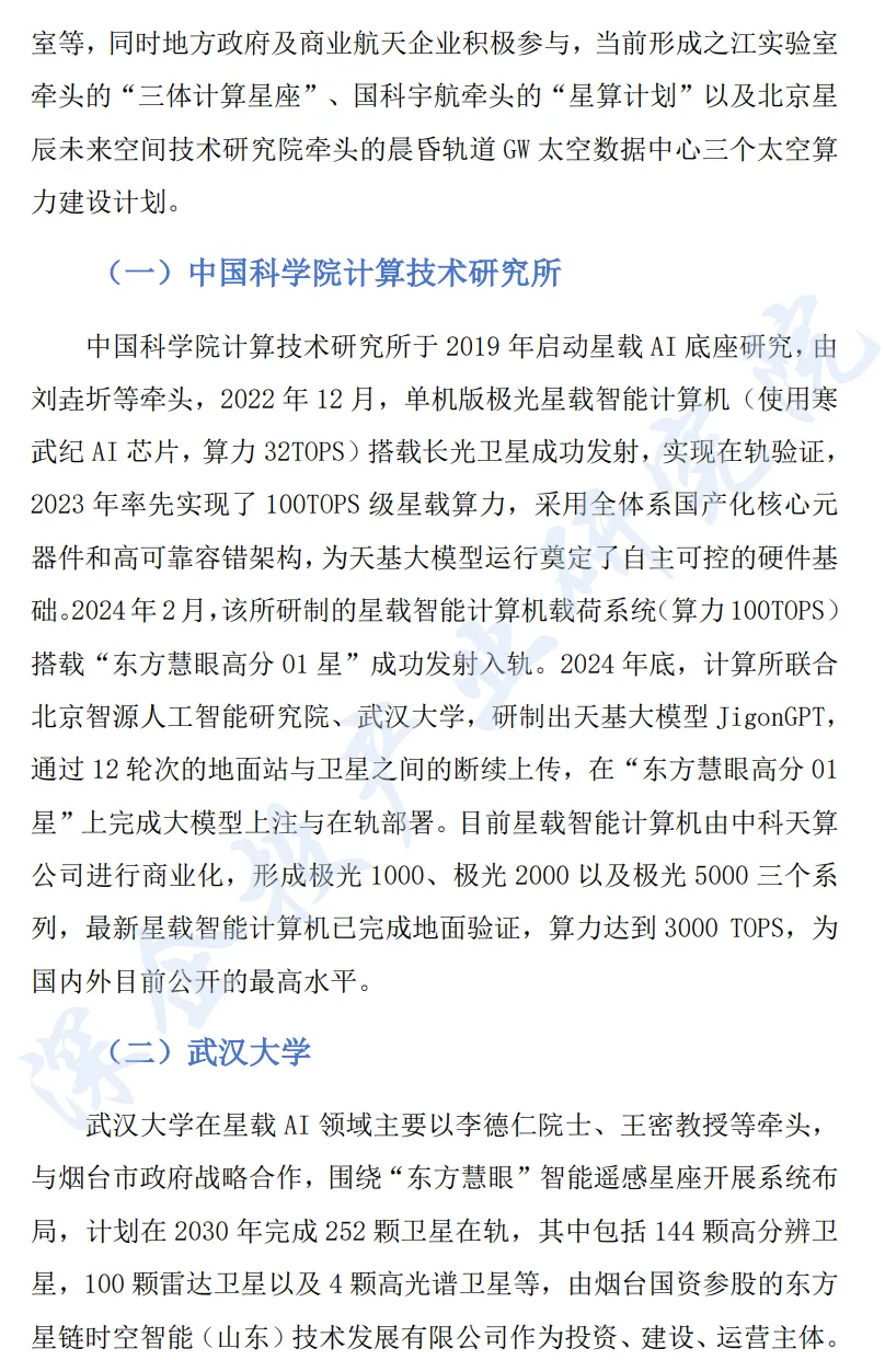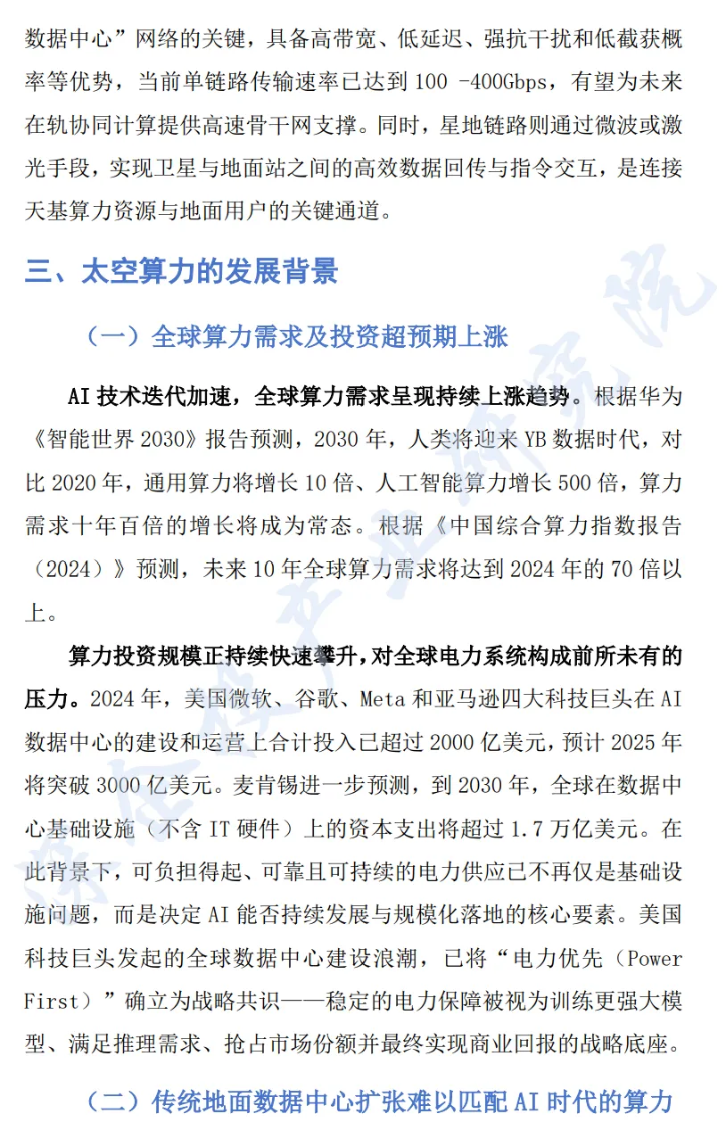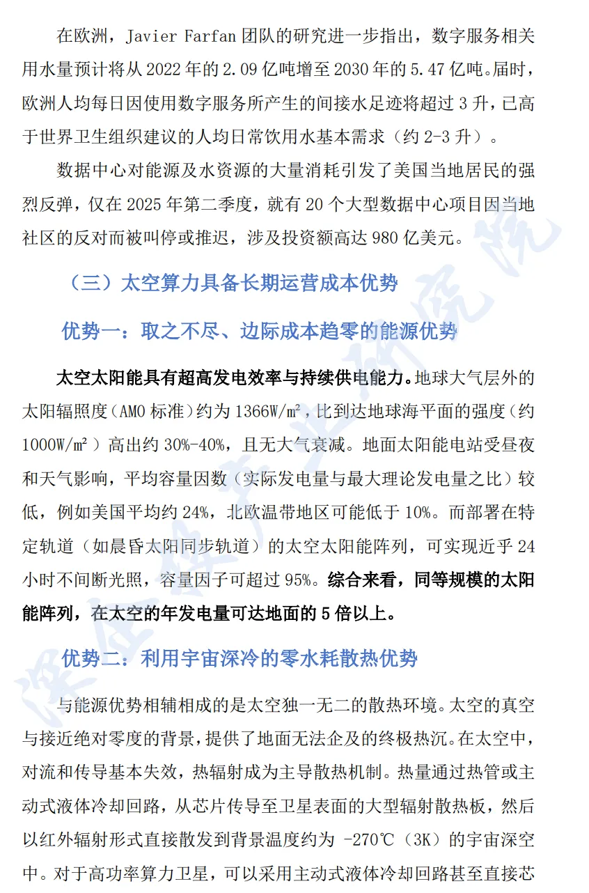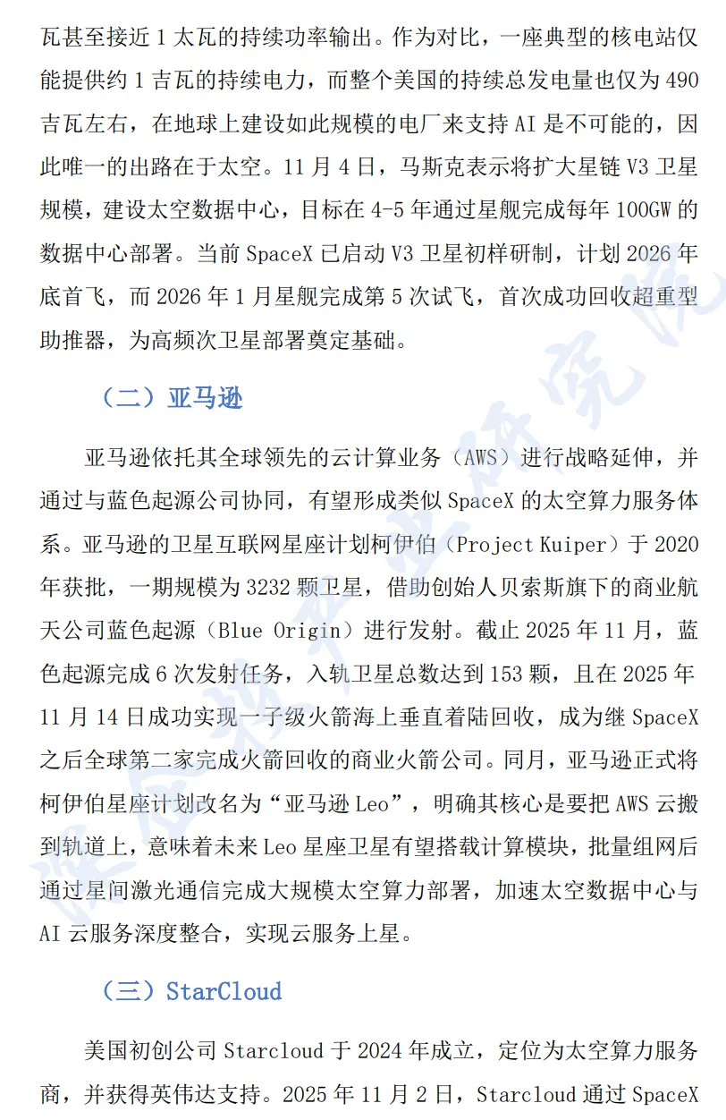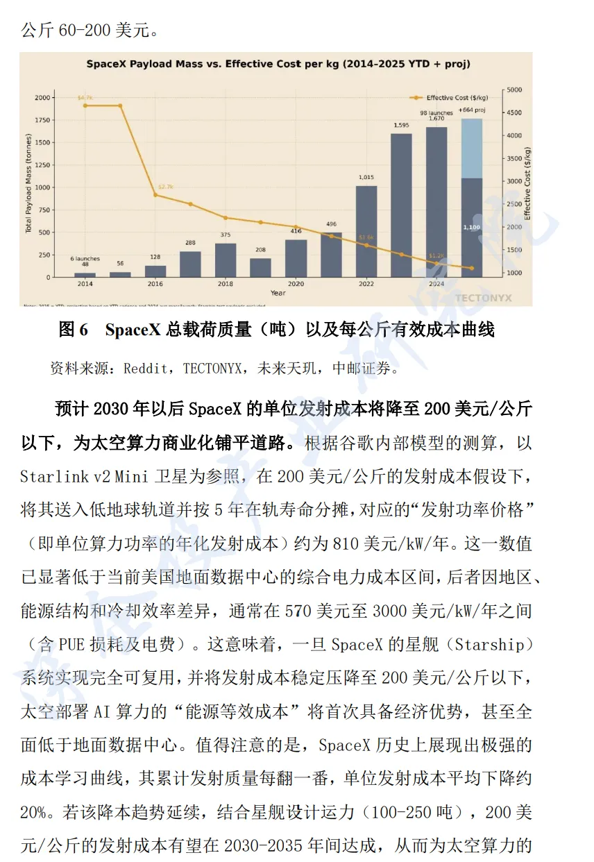 太空算力是商业航天与AI技术融合催生的新一代计算范式,其核心在于推动卫星从“天感地算”的数据采集终端,升级为具备在轨实时处理与智能决策能力的“天数天算”自主平台,并最终迈向“天地一体协同计算”。其发展根本驱动力在于,AI爆发式增长引发的全球算力需求,已使传统地面数据中心面临电力供给失衡、散热能耗与水资源消耗的巨大瓶颈;而太空凭借近乎无限的太阳能与宇宙深冷的零水耗散热环境,具备长期运营的结构性成本优势。当前,商业化落地的关键前提在于将发射成本降至约200美元/公斤这一临界点,业界预计随着SpaceX星舰等可重复使用重型火箭技术的成熟,该拐点有望在2030-2035年间实现。目前中美形成差异化发展路径:美国由科技巨头主导,依托成熟商业航天生态加速在轨验证与早期商业化;中国则以国家级实验室与地方政府协同引领,通过重大工程专项体系化推进。尽管面临太空能源、高可靠元器件、热管理、高速通信及在轨运维等系列工程技术挑战,但其总体突破路径已相对明确。【引用说明】:本文源自网络,版权归原作者所有,助力大家开展相关研究需要。