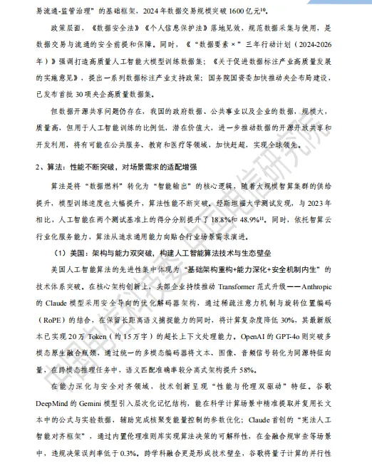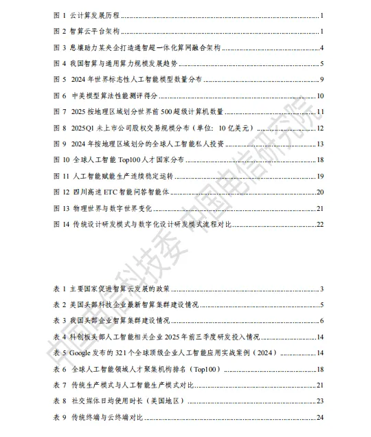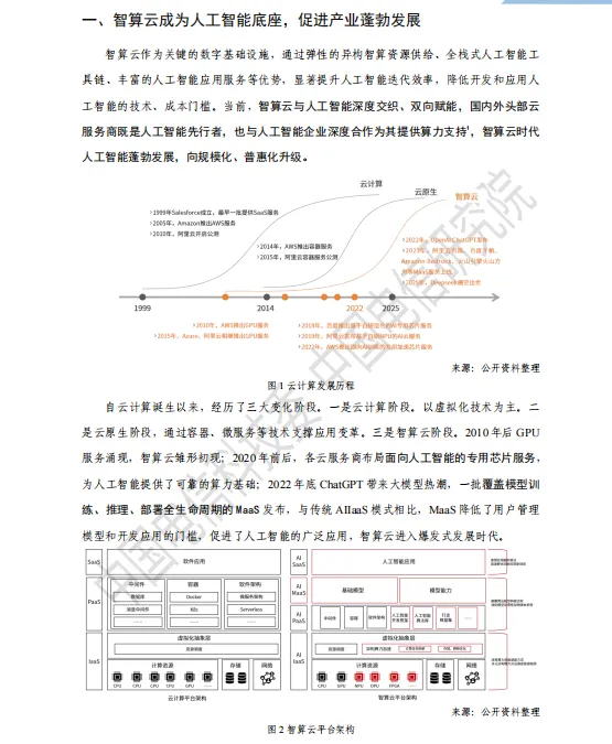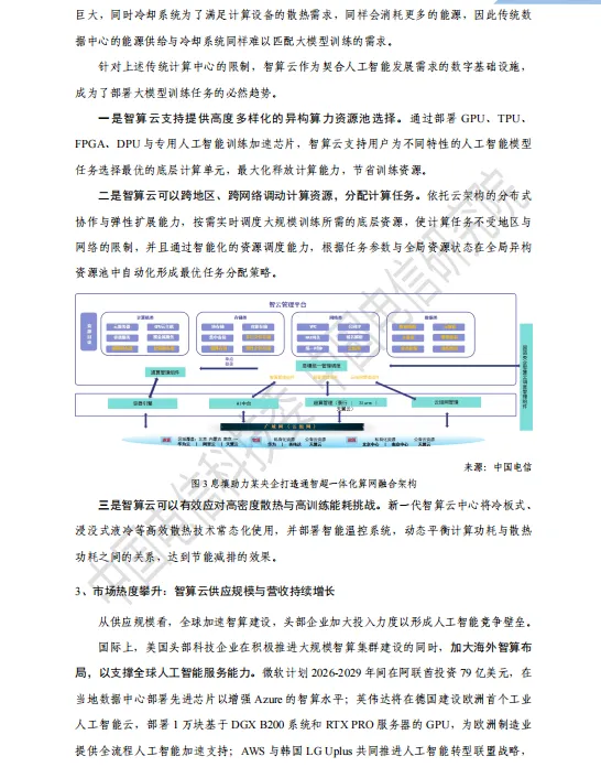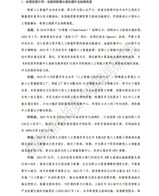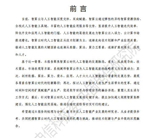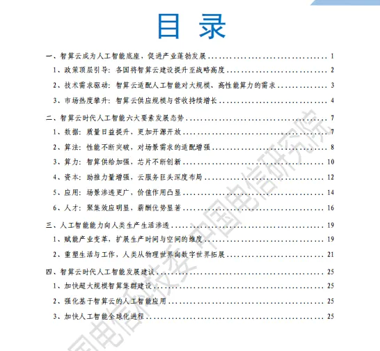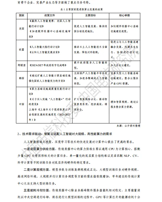 文档深入剖析了全球主要经济体将智算云建设提升至战略高度的政策动向——涵盖美国"星际之门"项目与《赢得人工智能竞赛》行动计划、欧盟"人工智能大陆行动计划"及《云和人工智能发展法案》、中国《算力基础设施高质量发展行动计划》及上海智算云产业实施意见等,并结合技术架构演进,分析了异构算力资源池化、跨地域分布式调度、液冷散热与智能温控等关键技术突破。报告指出,当前人工智能正从"技术创新为主"转向"技术创新与产业应用并重"的新阶段,通过赋能产业变革扩展生产的时间与空间维度(连续稳定运行、跨地域协同),并重塑人类生活工作方式,推动物理世界与数字世界双向交互渗透。