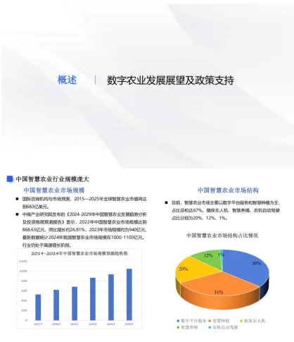 报告聚焦中国智慧农业高速增长态势,2024 年市场规模突破千亿,数字平台服务与智慧种植引领行业发展。从政策支持到技术创新,从市场潜力到典型实践,全方位解析产业发展逻辑。8 个标杆案例横跨综合种养、设施农业、跨境合作等多领域,解锁数字化赋能乡村振兴的多元路径。
