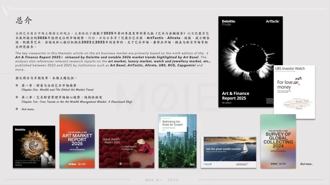 本期艺术商业市场主题推文的观点,主要依托于德勤于2025年第四季度发布的第九版《艺术与金融报告》以及巴塞尔艺术展所提出的2026年值得关注的市场趋势。同时,亦综合参考了巴塞尔艺术展、ArtTactic、Altrata、瑞银、波士顿咨询、凯捷等艺术、咨询及私人银行机构在2023至2025年间发布的,关于艺术市场、奢侈品市场、腕表与珠宝市场等相关研究报告。