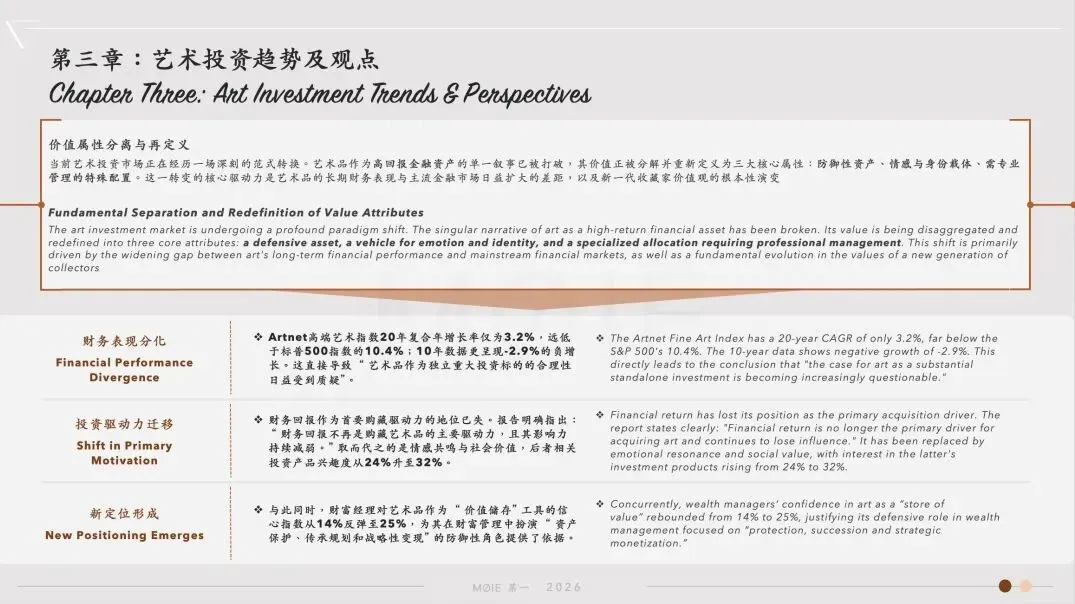 The reportstates clearly: "Financial return is no longer the primary driver foracquiring art and continues to lose influence." It has been replacedby emotional resonance and social value, with interest in the latter'sinvestment products rising from 24% to 32%.