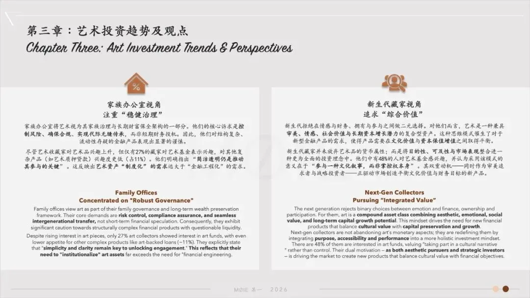 机构端(以家族办公室为代表)将艺术视为其家族治理与长期财富保全架构的一部分。他们的核心诉求是控制风险、确保合规、实现代际无缝传承,而非短期财务投机。因此,他们对结构复杂、流动性存疑的金融产品表现出显著的谨慎。