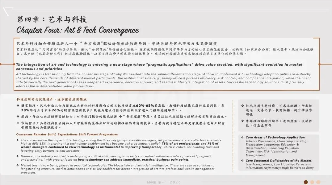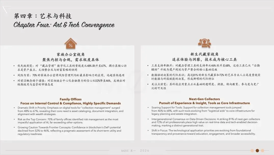 The field of art technology has moved beyond the early phase of conceptual enthusiasm and entered a new stage where "pragmatic application" drives tangible value creation. While industry consensus remains solid, expectations for technology have become more measured and focused. The paths of technology adoption are significantly diverging: institutionalinvestors (represented by family offices) seek internal integration tools for efficiency gains and risk control, whereas individual collectors (especially the next generation) favour participatory solutions that deepen engagement and empower decision-making.