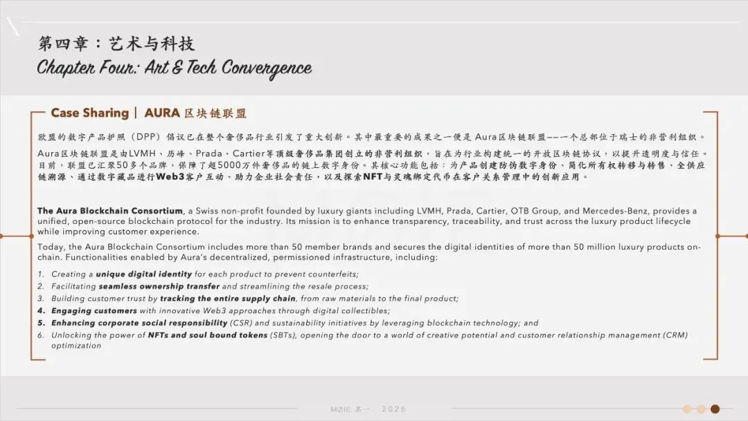 Aura区块链联盟是由LVMH、Prada、Cartier等顶级奢侈品集团创立的非营利组织,旨在为行业构建统一的开放区块链协议,以提升透明度与信任。目前,联盟已汇聚50多个品牌,保障了超5000万件奢侈品的链上数字身份。其核心功能包括:为产品创建防伪数字身份、简化所有权转移与转售、全供应链溯源、通过数字藏品进行Web3客户互动、助力企业社会责任,以及探索NFT与灵魂绑定代币在客户关系管理中的创新应用。