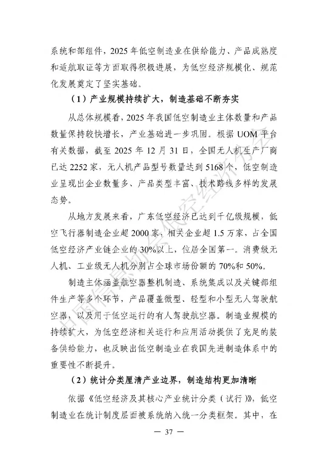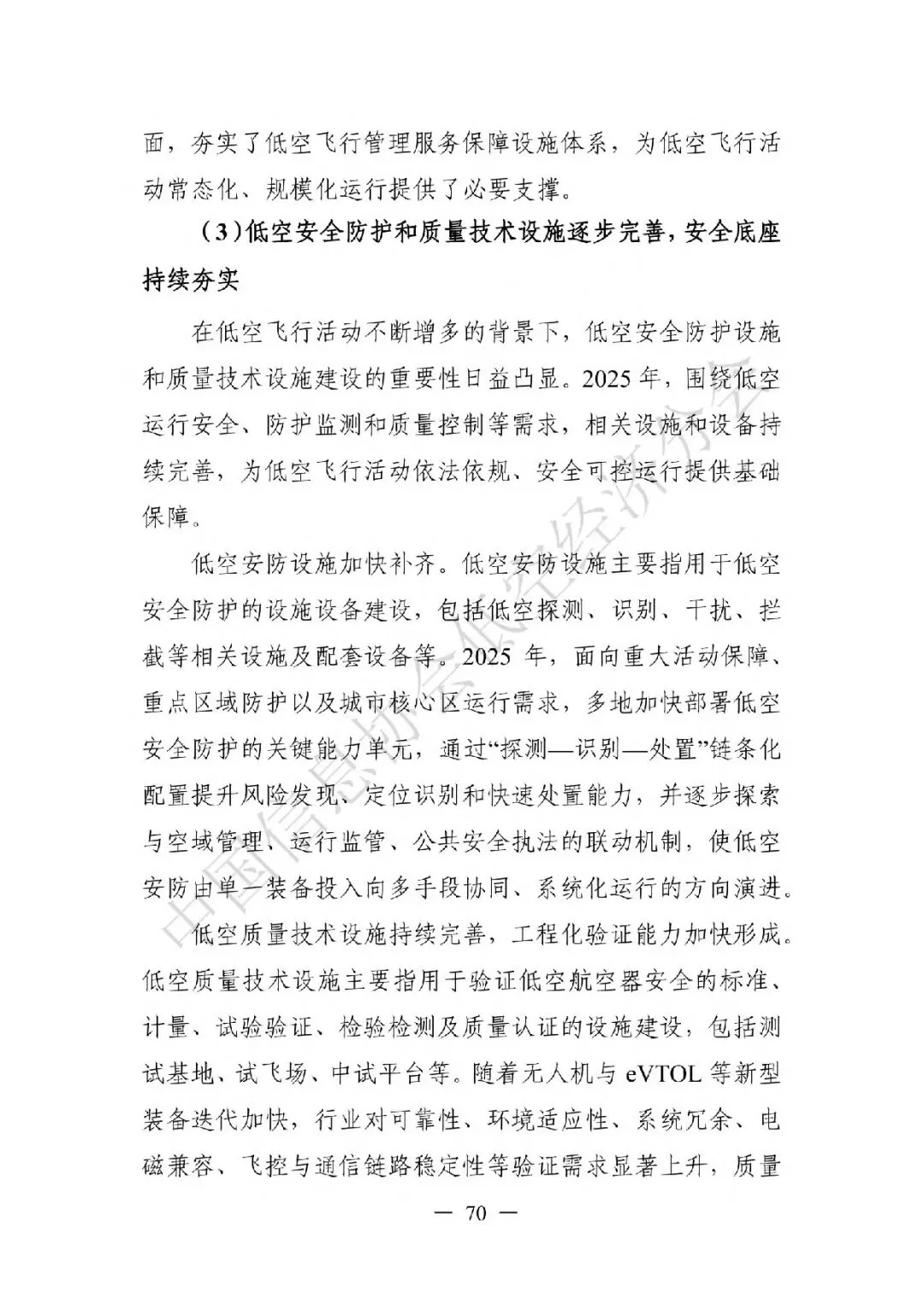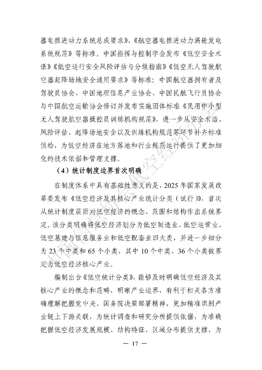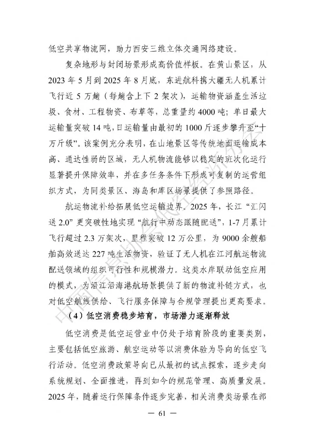 《报告》从八个维度系统梳理了2025年的发展脉络:在制度管理维度,顶层设计持续强化,《中华人民共和国民用航空法》完成系统性修订,首次从国家法律层面为无人驾驶航空器等活动提供制度框架;国家发展改革委发布《低空经济及其核心产业统计分类(试行)》,首次统一了产业统计口径;“三先三后”(先载货后载人、先隔离后融合、先远郊后城区)推进原则为行业安全有序发展指明了路径。在产业发展维度,低空制造业、运营业、基建与信息服务业、配套业协同发力,产业体系加快成型,应用场景持续拓展,商业落地步伐加速。