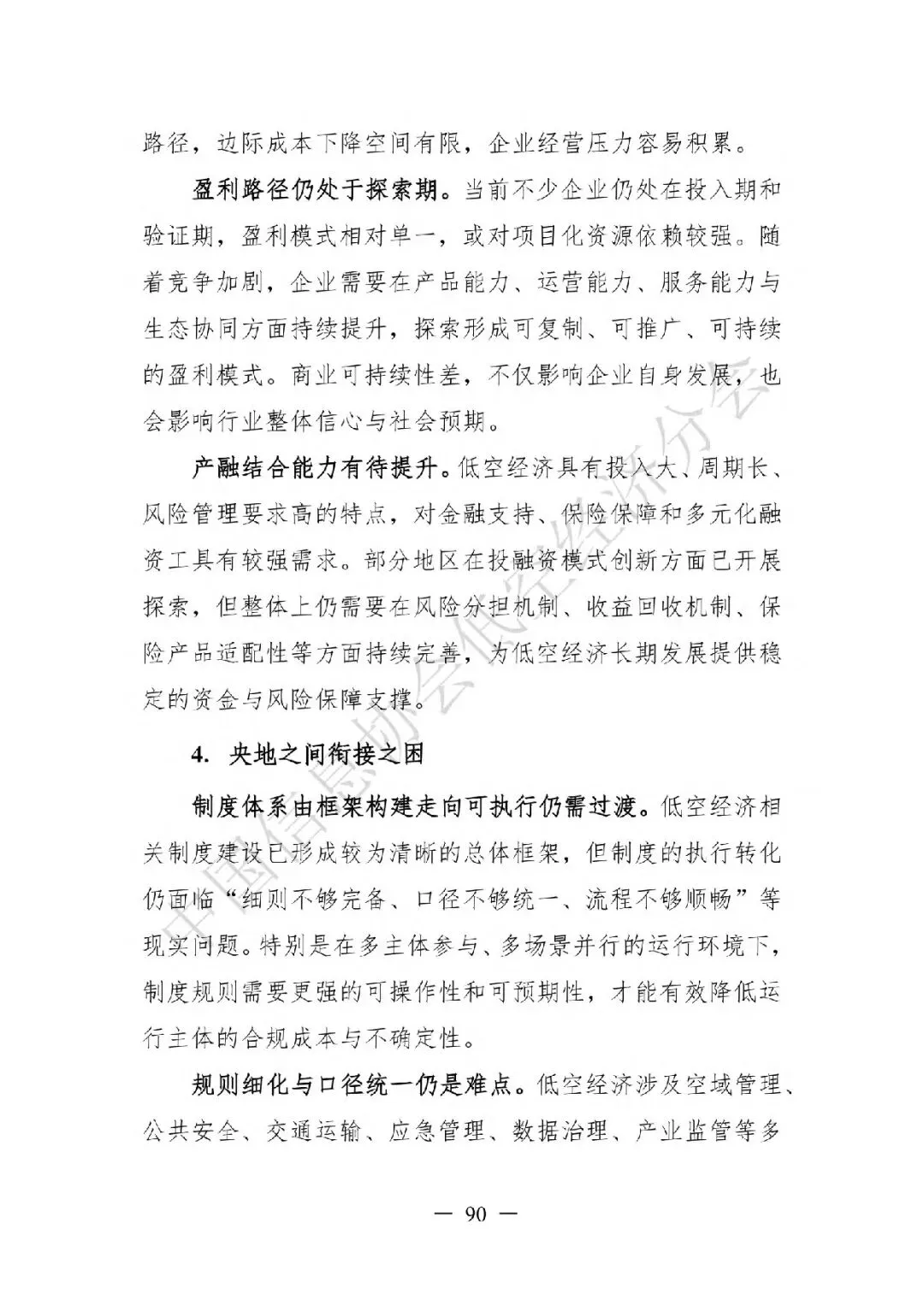 《报告》在系统梳理低空经济八个维度发展的基础上,聚焦于发展进程中亟待破解的关键矛盾。深入剖析了当前面临的六大核心挑战:安全与发展的平衡之困、区域同质化竞争之困、有效市场需求培育之困、央地政策协同之困、基础设施常态化运行之困,以及多元主体治理协同之困。这些挑战相互关联,共同构成了制约产业健康、可持续发展的主要瓶颈。报告旨在通过对这些深层问题的辨析,为探寻破局路径提供参考。