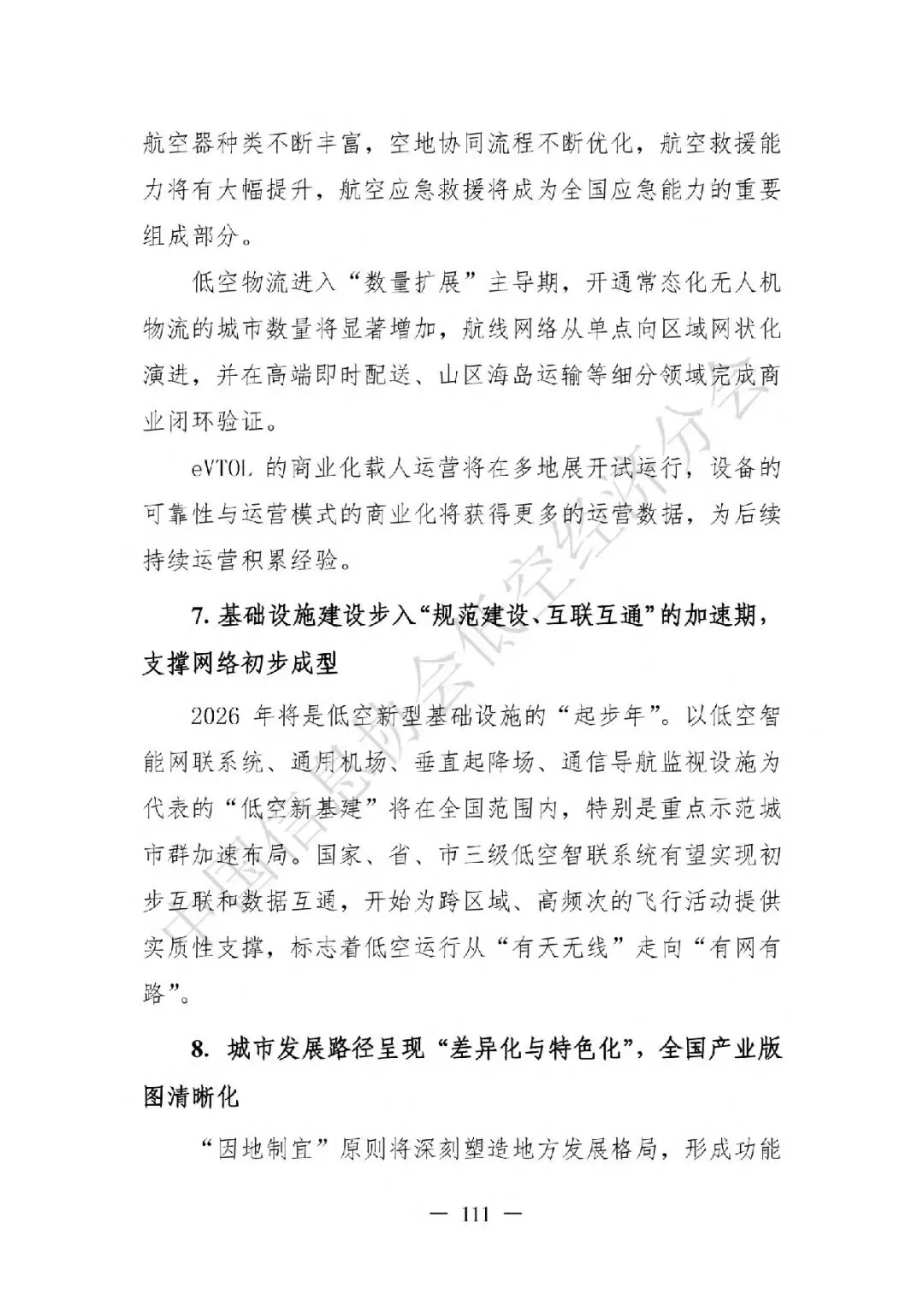 《报告》特别指出,2026年作为“十五五”开局之年,将是低空经济从“制度框架构建期”迈向“项目落地启动期”的关键转折点。产业发展预计将从“前瞻布局”走向“落地实施”、从“局部试点”走向“体系突破”,具体表现为:政策实施将加速转向细则制定与执行,安全治理向“体系协同”升级,空域供给与使用迈向“稳定高效”,制造业在工程化与交付能力上寻求关键突破,运营服务环节将率先呈现稳定业态,应用场景实现分类发展与纵深拓展,以低空智能网联系统为代表的新型基础设施建设步入互联互通加速期,各地将依据禀赋走出差异化、特色化发展道路。