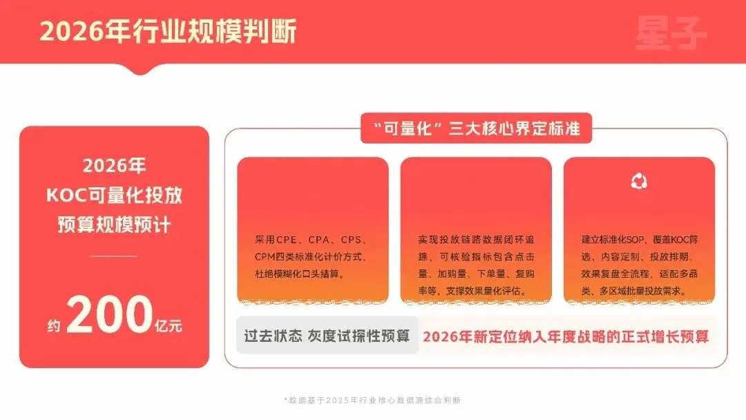 2026年,KOC行业正式进入“规模扩张与效率挤压期”,从“可选打法”演化为“增长基础设施”,可量化投放预算规模预计达200亿元。行业核心价值已从“内容结果”迁移到“结构能力”,能否长期稳定承接预算、系统性复用、纳入组织管理,成为关键衡量标准。