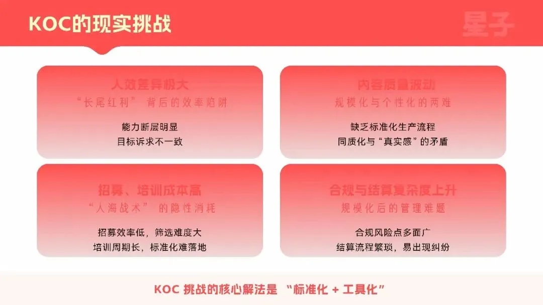 过去五年,KOC行业经历了可行性验证、规模扩张、效率挤压、专业化四个阶段,如今媒介权力从“媒介型MCN”转向“KOC执行平台”。大厂纷纷入场系统性使用KOC,核心原因在于其适配“低成本、可量化、高转化、能规模化”的增长需求,完美解决获客成本上升、渠道依赖风险高等痛点。