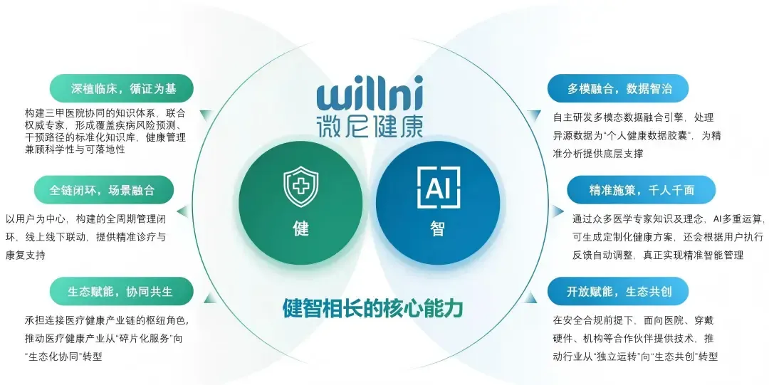 公司由国家级人才、高层次 AI 专家团队领衔,深度融合临床需求与前沿技术,凭借 “智健相长” 的技术和业务能力,自主研发主动健康北斗智控中枢,成功推动健康管理服务从传统经验驱动向精准数据驱动的范式转型。
