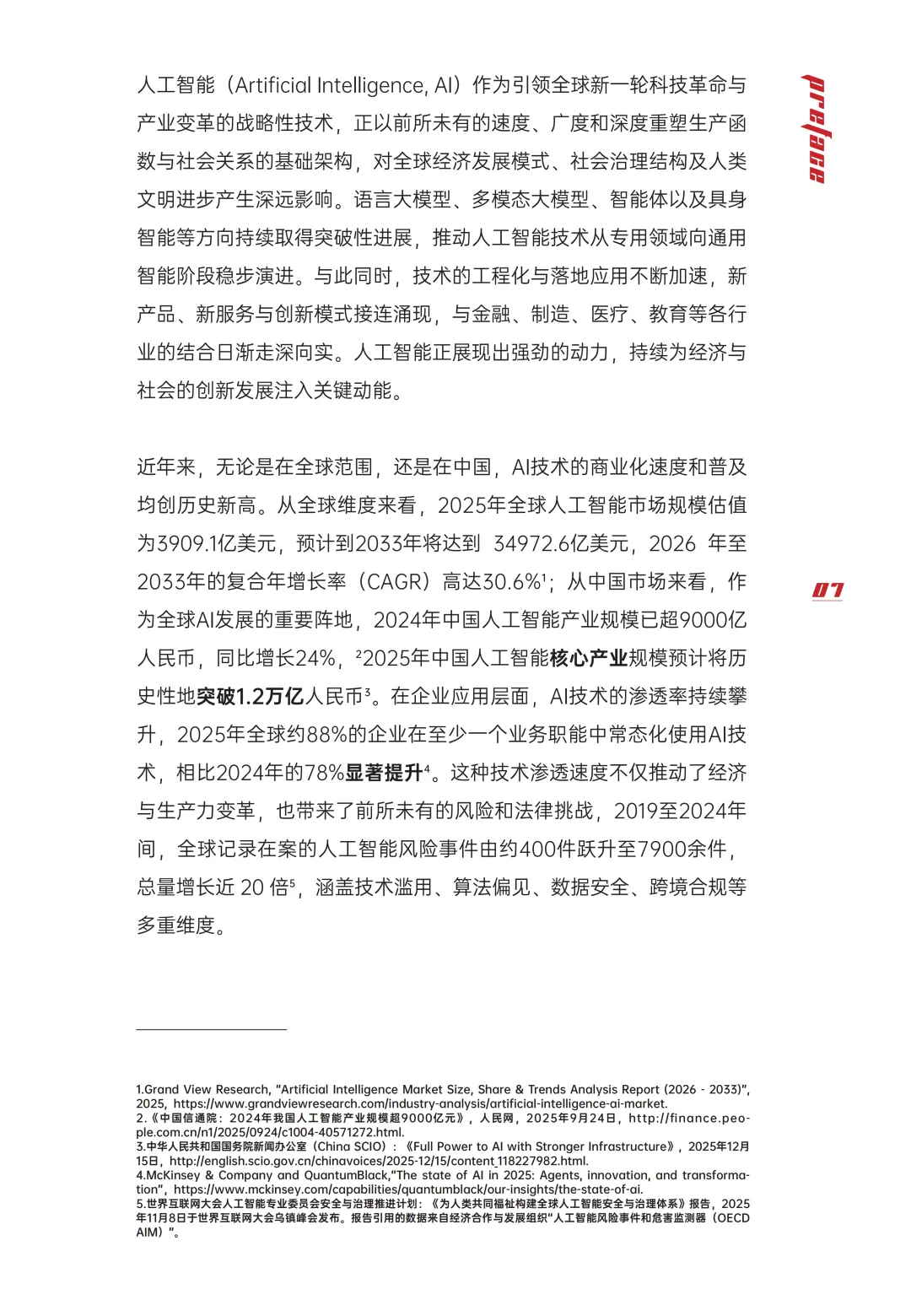 人工智能 3.0 正以迅猛之势重塑全球经济与社会,成为新一轮科技革命的核心引擎。2025 年全球人工智能市场规模达 3909.1 亿美元,预计 2033 年将增至 34972.6 亿美元,中国市场 2025 年核心产业规模有望突破 1.2 万亿人民币。但技术爆发式增长背后,全球 AI 风险事件 5 年间增长近 20 倍,涵盖技术滥用、数据安全等多重挑战,推动各国加速构建监管体系。···
