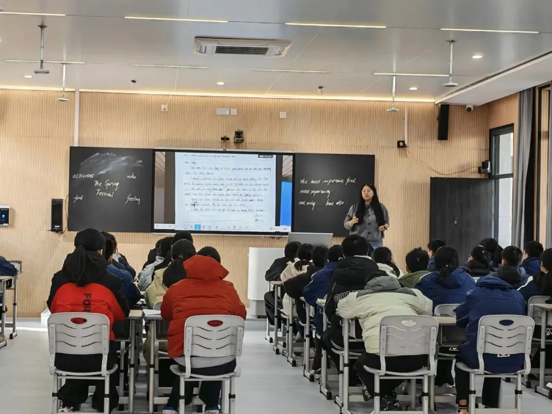 屈黎姿老师带来了一堂主题为“Writing: A Letter to Judy About the Spring Festival”的写作课。课堂以Judy的书信导入,迅速激活学生已知的书信格式知识,随后通过拆解书信的五大要素,搭建清晰支架。在内容建构上,围绕“和谁过、做什么、吃什么、有何感受”四个维度,提供丰富的春节主题词汇与实用句型,让学生在支架辅助下展开写作。课堂中,自主写作、同伴互评、成果分享等环节层层递进,既培养了学生的英语表达能力,又通过中西方节日对比,深化了文化自信与跨文化理解意识。