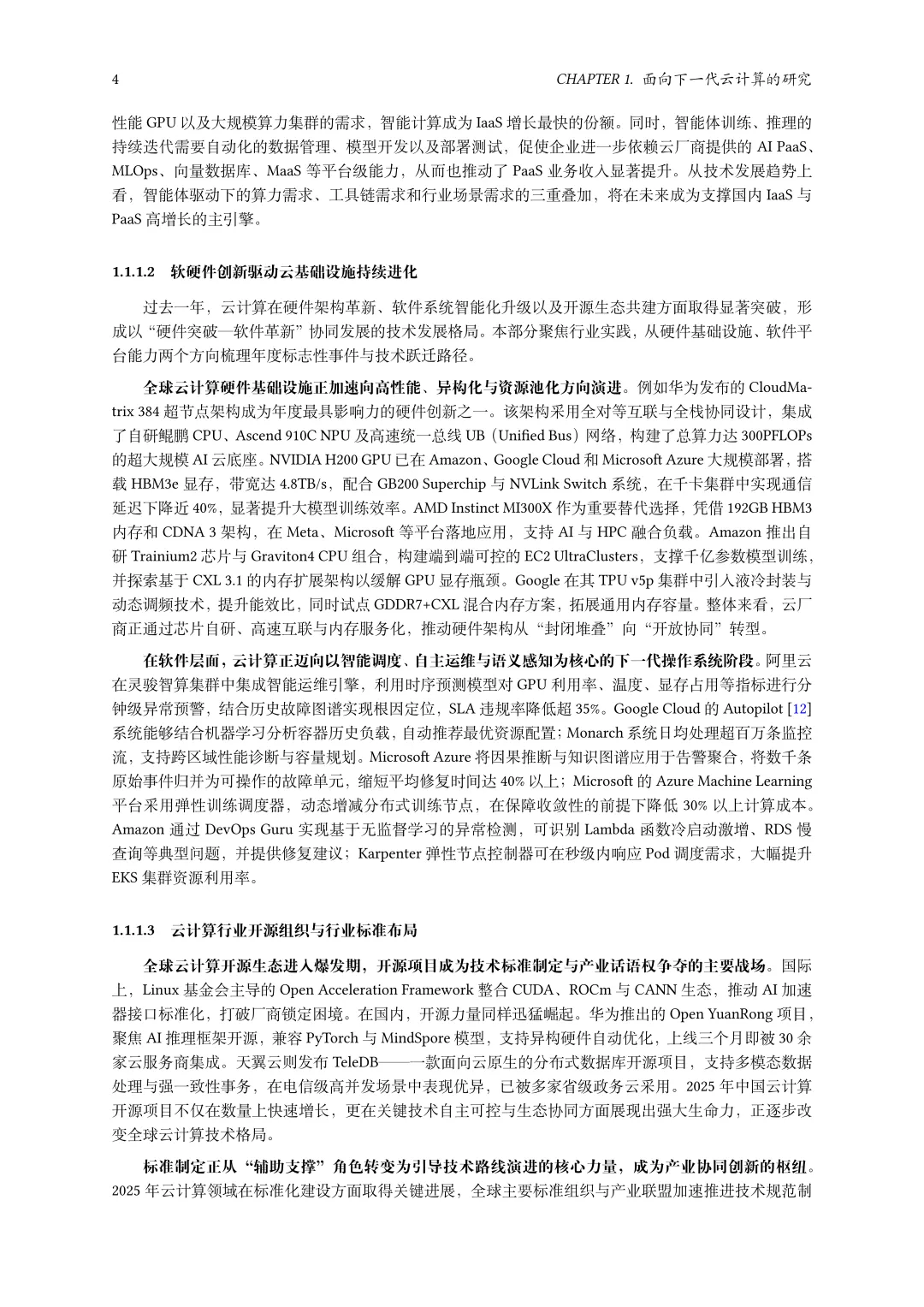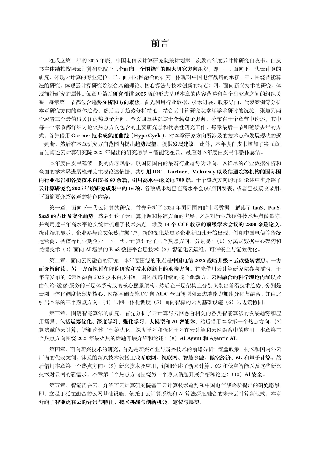 白皮书主体分为五大章节。前四章分别聚焦面向下一代云计算、面向云网融合、围绕智能算法、面向新兴技术的研究,第五章阐述智能泛在云愿景及总结。十大热点方向涵盖分离式数据中心架构、面向 AI 场景的 PaaS 数据平台层技术、智能化云运维与安全能效优化、云网一体化调度等关键领域,均结合行业数据、学术进展与企业实践展开深度分析。