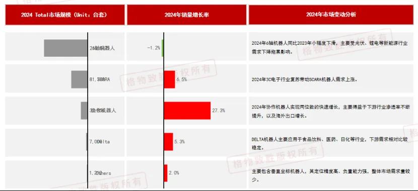 协作机器人实现两位数增长,SCARA和DELTA机器人小幅度增长,6轴机器人受新能源行业需求下滑拖累略微下滑。