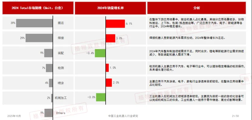 整体应用场景中,搬运和焊接占比最高,合计占比达到60%以上,2024年保持稳定增长。