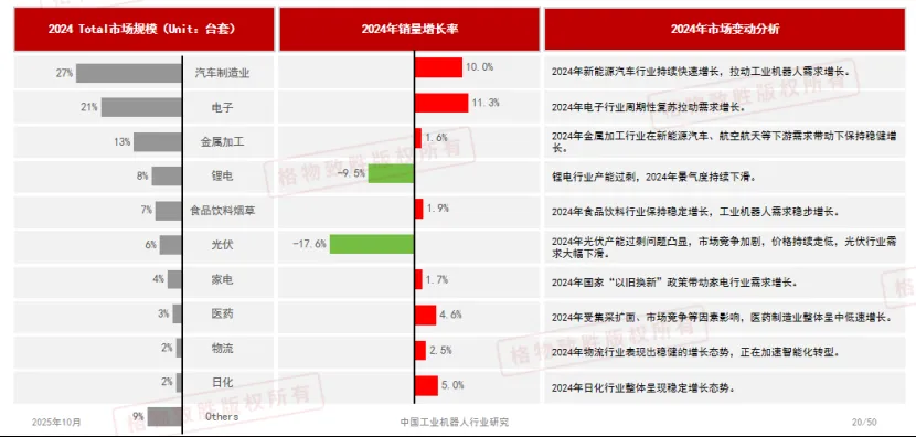 2024年工业机器人销量主要增长驱动行业为汽车制造业、电子、日化、医药等行业,锂电、光伏等新能源行业需求大幅下滑。