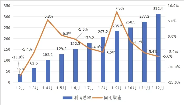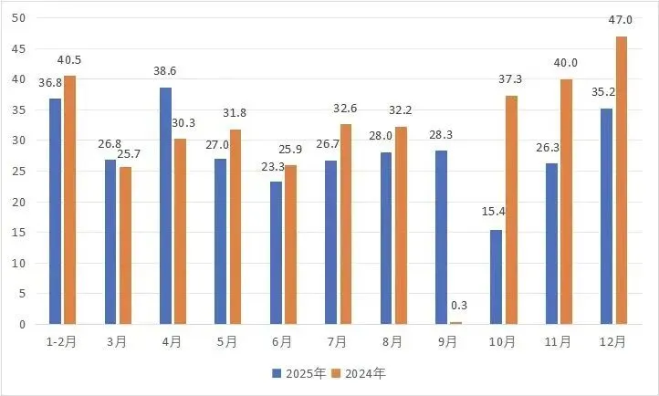盈利端波动更为显著,全年有三个月利润总额高于上年同期(3月、4月、9月),上半年合计利润与上年基本持平;三季度受2024年同期基数较低影响,同比增长27.50%;但四季度盈利大幅收缩,三个月合计利润总额76.9亿元,同比下降38.13%,较上年同期减少47.4亿元,直接拉低全年盈利水平。