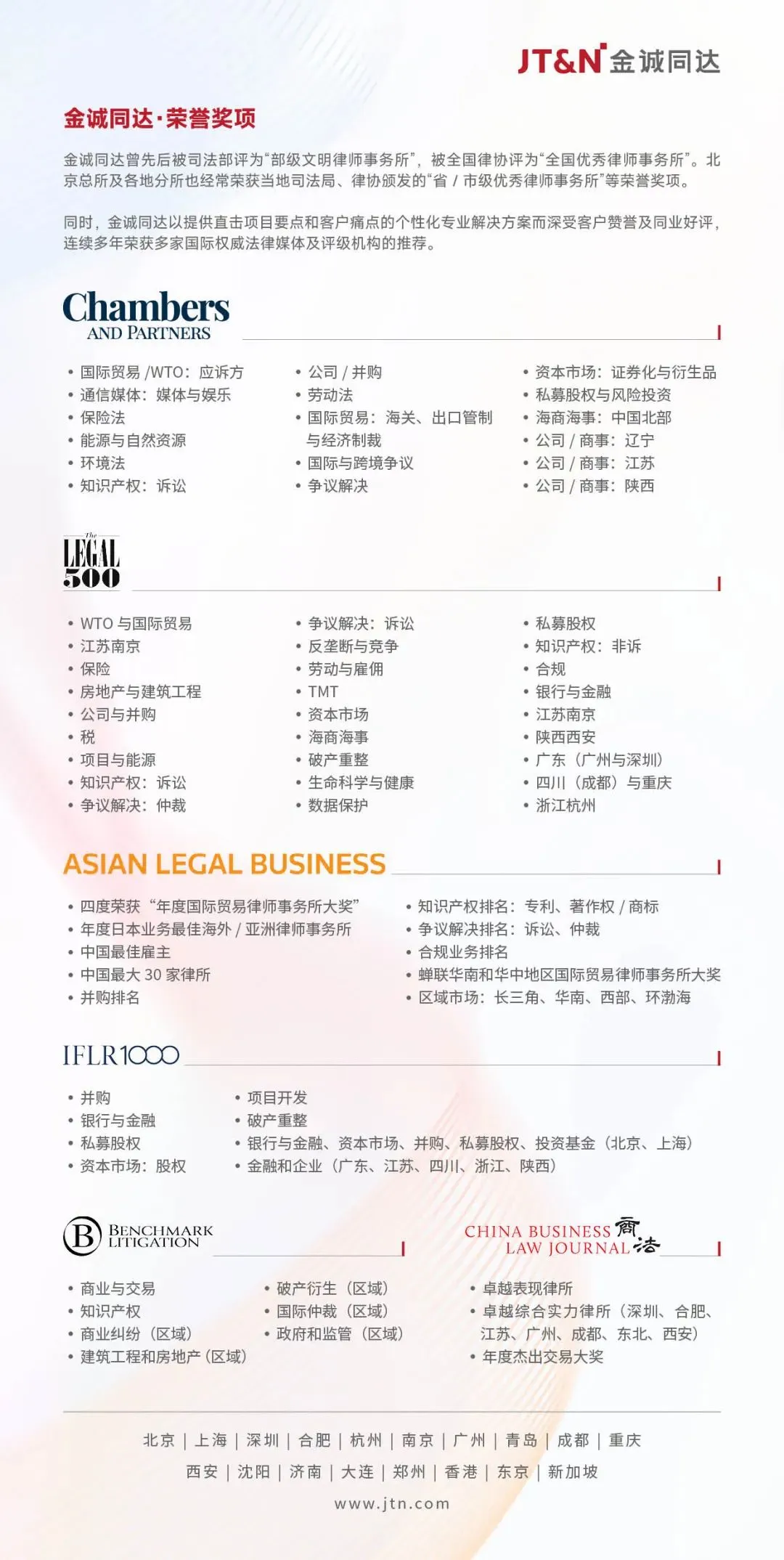 金诚同达团队阵容强大、专业突出,在业界具有良好的声誉及较高的知名度。金诚同达深耕近 40 项专业领域,致力于为客户提供全方位、一站式的优质法律服务。不仅能在单一业务层面提供高水准的优质服务,更加擅长整合资源,为复杂的商业活动提供综合性及创新性解决方案。金诚同达在代理高级法院、最高法院一、二审和再审诉讼案件方面享有良好声誉,代理的许多重大、疑难案件曾多次收录于最高人民法院编撰的《中国审判指导丛书》。