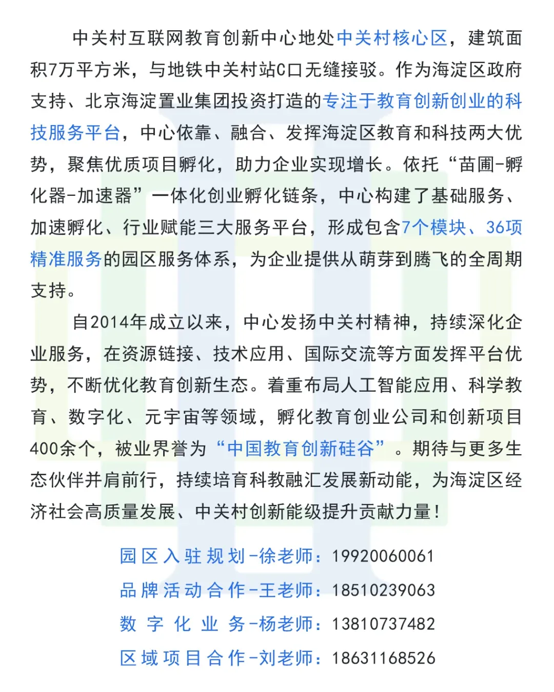 一月系列活动的圆满开展,是中关村互联网教育创新中心赋能教育科技企业高质量发展的鲜活实践。从政策红利解码到合规风险防控,从融资渠道拓展到标杆经验借鉴,中心始终秉持“资源链接者”与“成长陪伴者”的核心定位,精准锚定企业核心发展需求,搭建起全链条、全周期的孵化服务平台。未来,中心将继续聚焦教育科技前沿,不断深化服务内涵,整合优质资源,推出更多靶向性强、实用性高的科技服务活动,陪伴广大教育科技中小企业稳步成长,助力企业行稳致远、发展壮大。