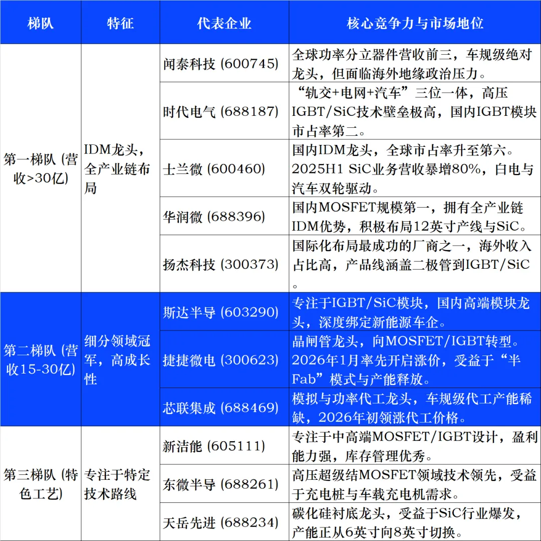 3. 功率半导体竞争格局与重点公司分析当前功率半导体板块已形成清晰的梯队,从“同质化内卷”走向“差异化竞争”。3.1 竞争梯队与市场地位