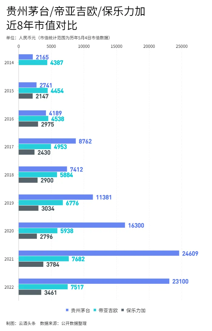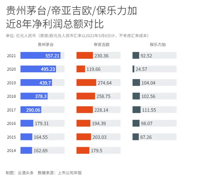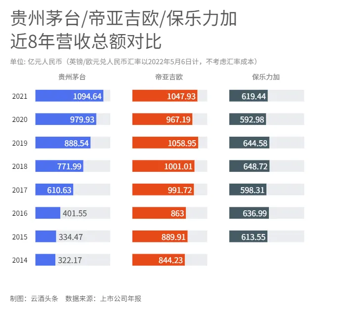 同样是烈酒龙头企业,对比帝亚吉欧、贵州茅台、保乐力加三家企业近8年的财报,除了市值和盈利能力的变化,其自身逻辑的变化,或许更能预见中国白酒未来发展的坐标。