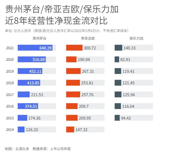 4. 从经营性净现金流的角度也可以看出,帝亚吉欧和保乐力加已经进入成熟稳定的经营周期,而贵州茅台还处在快速成长期。