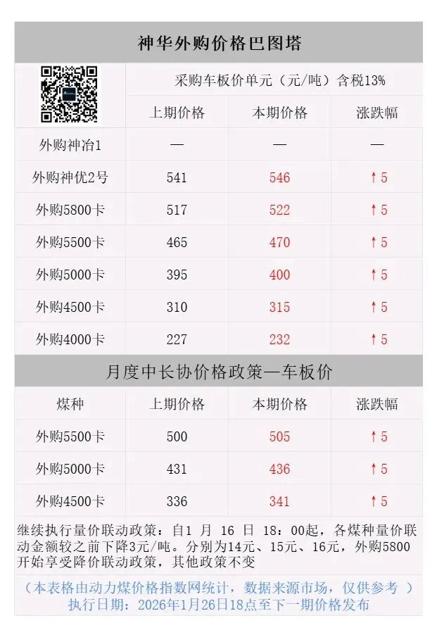 神华外购巴图塔采购价上调5元,执行日期:2026年1月26日18点至下一期价格发布