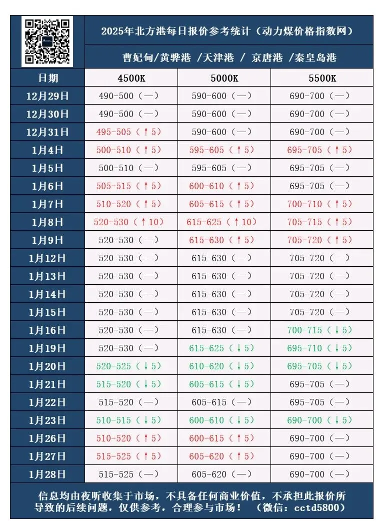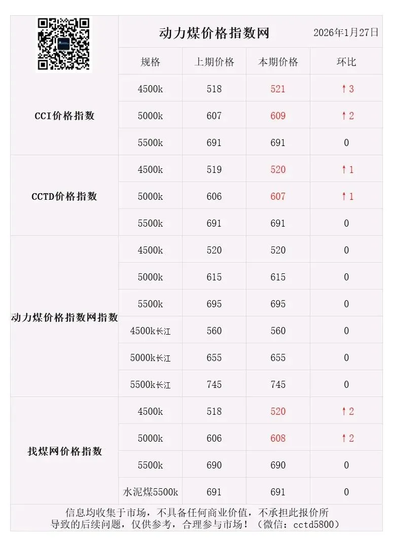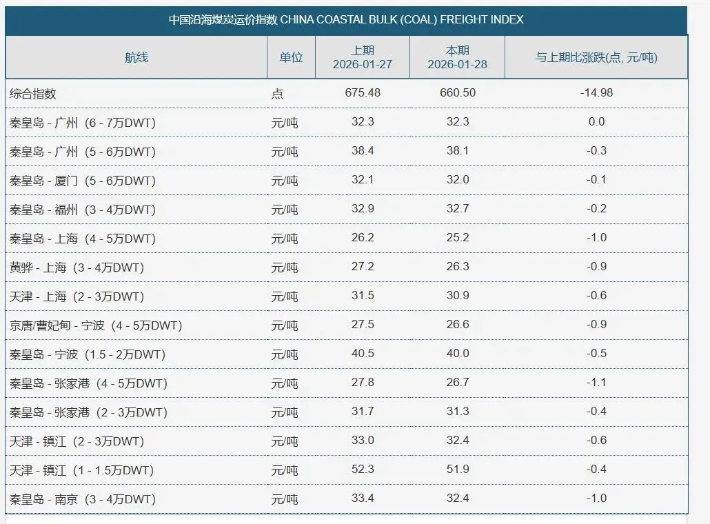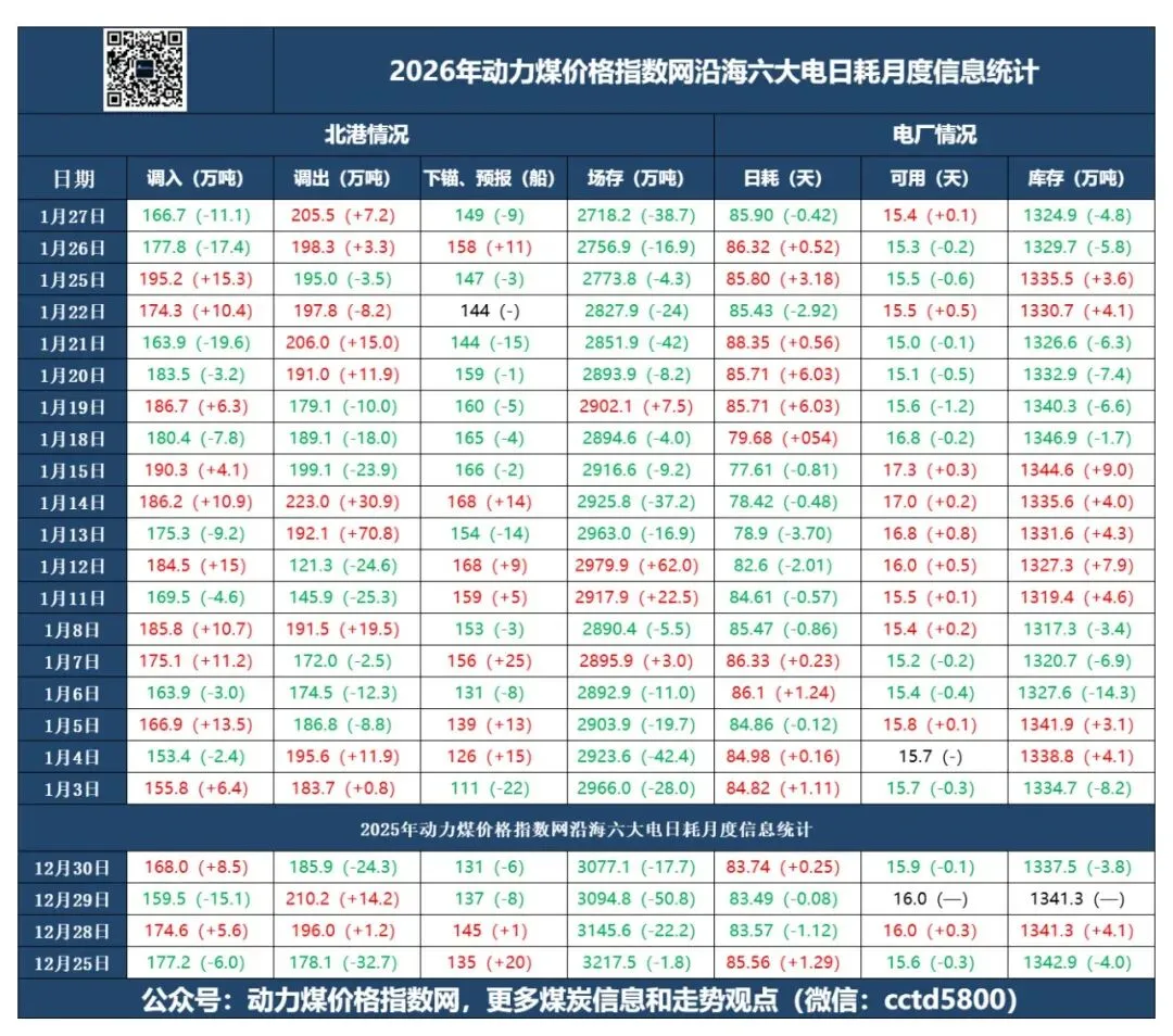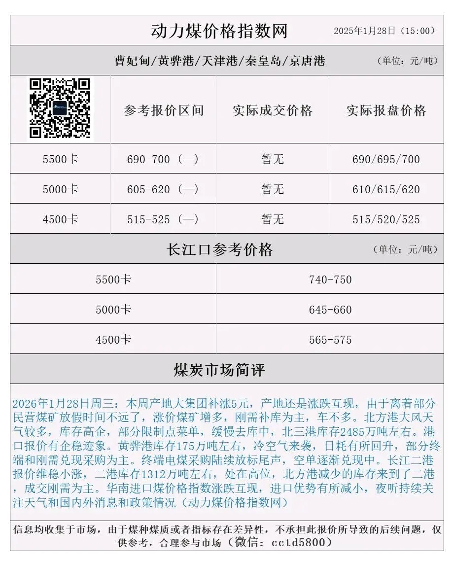 2026年1月28日周三:本周产地大集团补涨5元,产地还是涨跌互现,由于离着部分民营煤矿放假时间不远了,涨价煤矿增多,刚需补库为主,车不多。北方港大风天气较多,库存高企,部分限制点菜单,缓慢去库中,北三港库存2485万吨左右。港口报价有企稳迹象。黄骅港库存175万吨左右,冷空气来袭,日耗有所回升,部分终端和刚需兑现采购为主。终端电煤采购陆续放标尾声,空单逐渐兑现中。长江二港报价维稳小涨,二港库存1312万吨左右,处在高位,北方港减少的库存来到了二港,成交刚需为主。华南进口煤价格指数涨跌互现,进口优势有所减小,夜听持续关注天气和国内外消息和政策情况(动力煤价格指数网)
