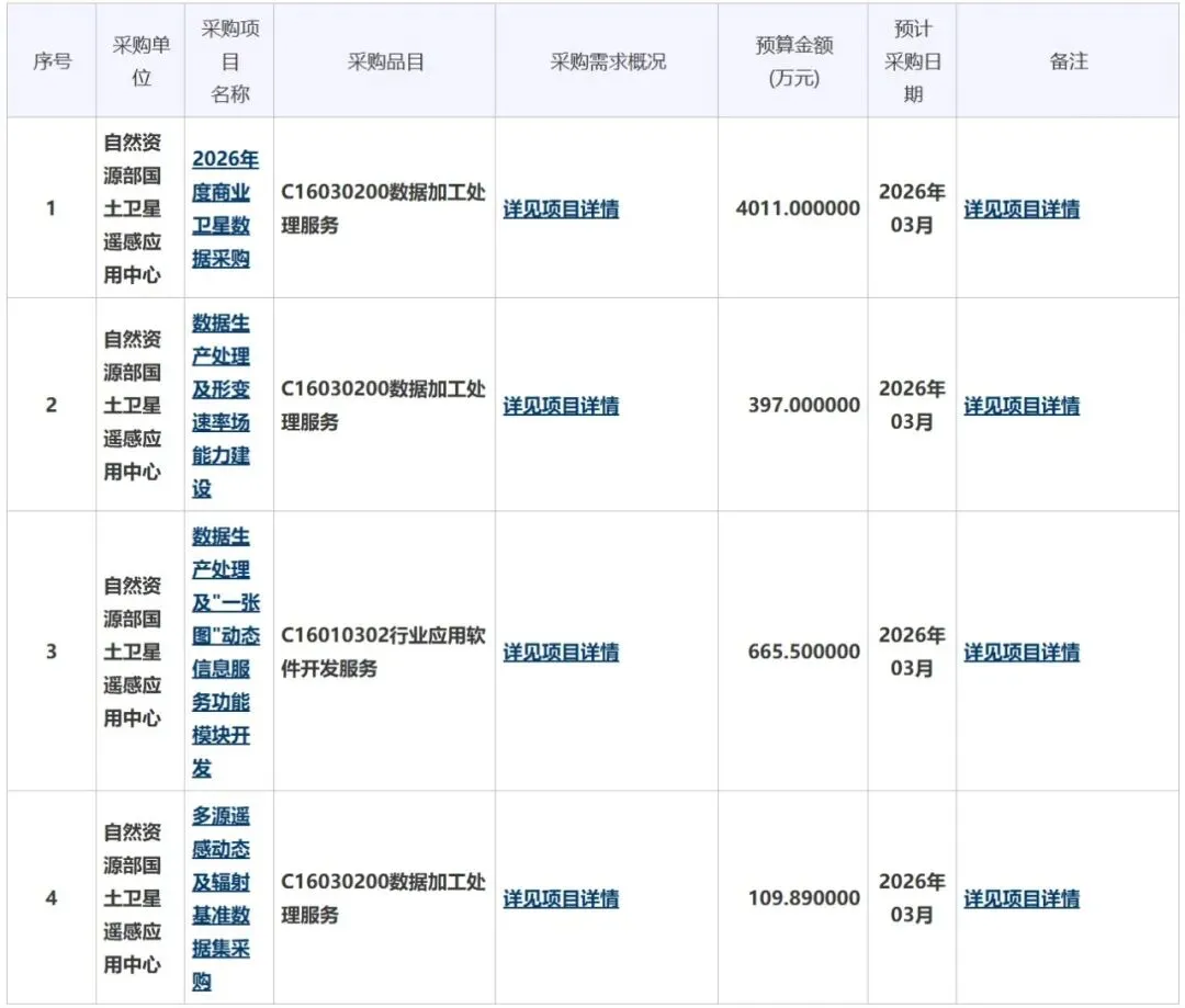 近日,中国政府采购网发布了自然资源部国土卫星遥感应用中心2026年1至12月政府采购意向。