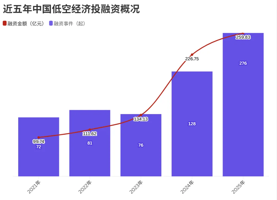 2021年至2025年,中国低空经济融资金额从99.74亿元一路飙升至259.83亿元,五年间增幅超160%;融资事件数量也从72起跃升至276起,增长近3倍。这组数据直观展现了低空经济从“小众赛道”向“风口产业”的跨越。