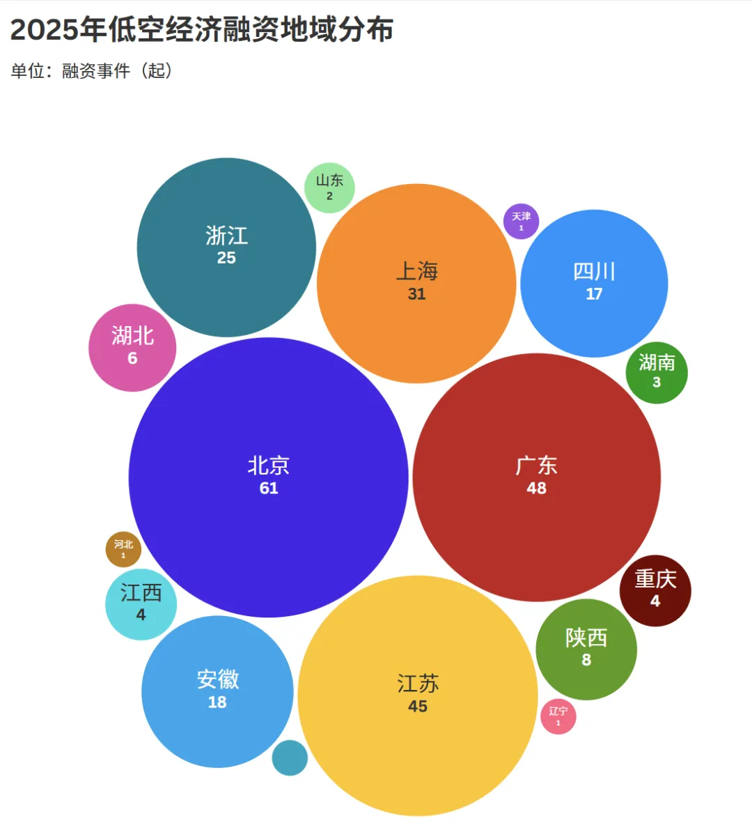 北京以61起融资事件位居全国首位,凭借政策资源、资本密度和技术人才优势,成为低空经济创新项目的核心孵化地。广东(48起)、江苏(45起)、上海(31起)紧随其后,构成第二梯队,依托制造业基础与产业链配套能力,成为低空飞行器制造、场景应用的核心阵地。浙江(25起)、安徽(18起)、四川(17起)等省市则凭借特色产业布局,在细分赛道形成差异化竞争力。