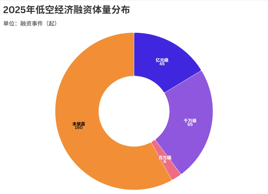 从已披露数据来看,千万级融资事件以65起成为绝对主力,占已披露总量的50%以上。这一数据反映出低空经济正处于规模化孵化阶段,大量具备技术落地能力的项目进入快速成长期,资本通过千万级注资支持其完成技术迭代与场景验证。这类项目多集中在无人机物流、低空测绘等成熟场景,是当前产业生态的核心组成部分。
