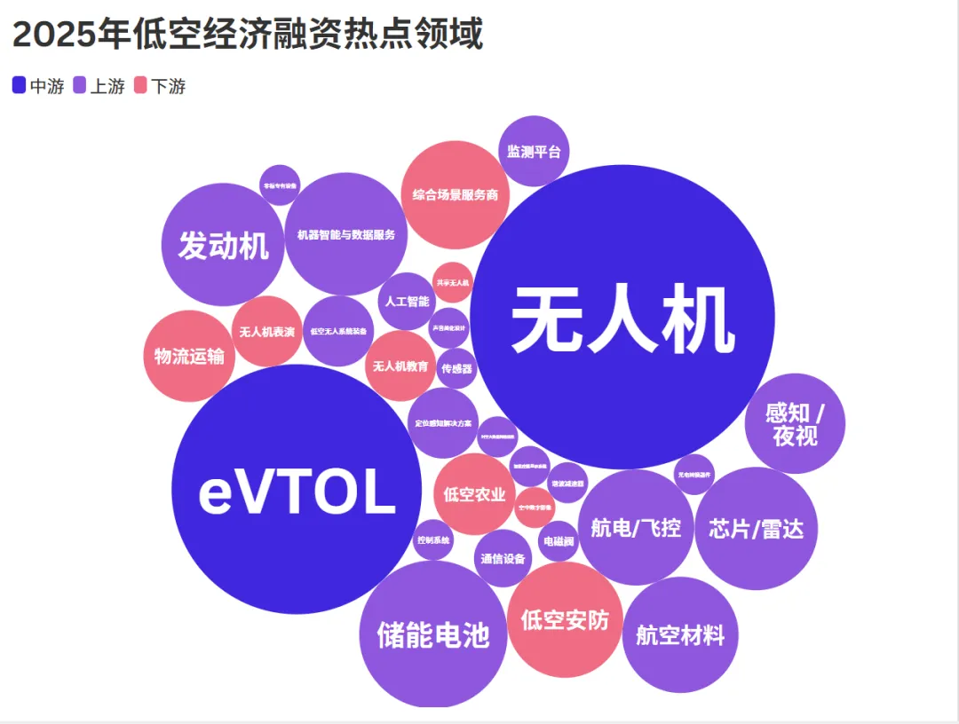 2025年中国低空经济融资热点领域图谱显示,行业融资已形成“中游装备为核心、上下游协同联动”的格局,资本围绕技术突破与场景落地双向发力,推动产业生态加速成熟。