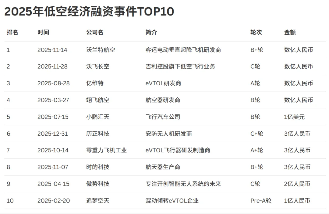 值得关注的是,小鹏汇天以1亿美元B轮融资跻身前五,成为唯一明确披露美元金额的企业,反映出国际资本对中国低空经济的高度关注。此外,沃飞长空作为吉利控股旗下的低空飞行业务平台,凭借C轮数亿人民币融资位列第二,体现了产业资本通过集团化布局深度参与低空经济的趋势。