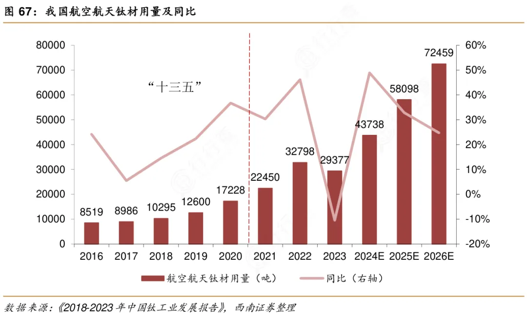根据中国有色金属工业协会预测,2026年国内航天航空领域钛材消费突破5.8万吨,同比增长约为30%。随着国内民用航天领域的发展,高端钛材的需求量有望继续保持20%-30%左右的高速增长。