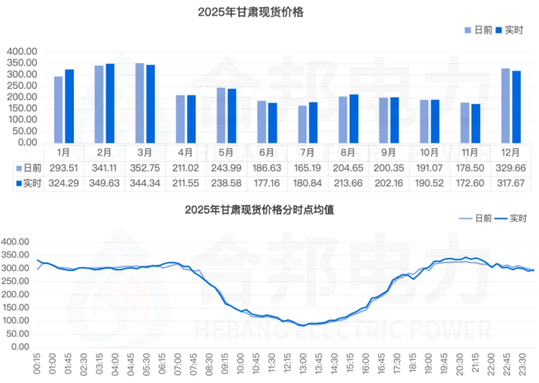 甘肃电价受新能源出力影响显著,价格整体偏低且波动平缓,实时市场偶尔出现紧张推高价格,整体电价水平明显低于广东。电价在冬季12月、1月和午间光伏大发时段出现低谷,反映新能源渗透率高对电价的压制作用。