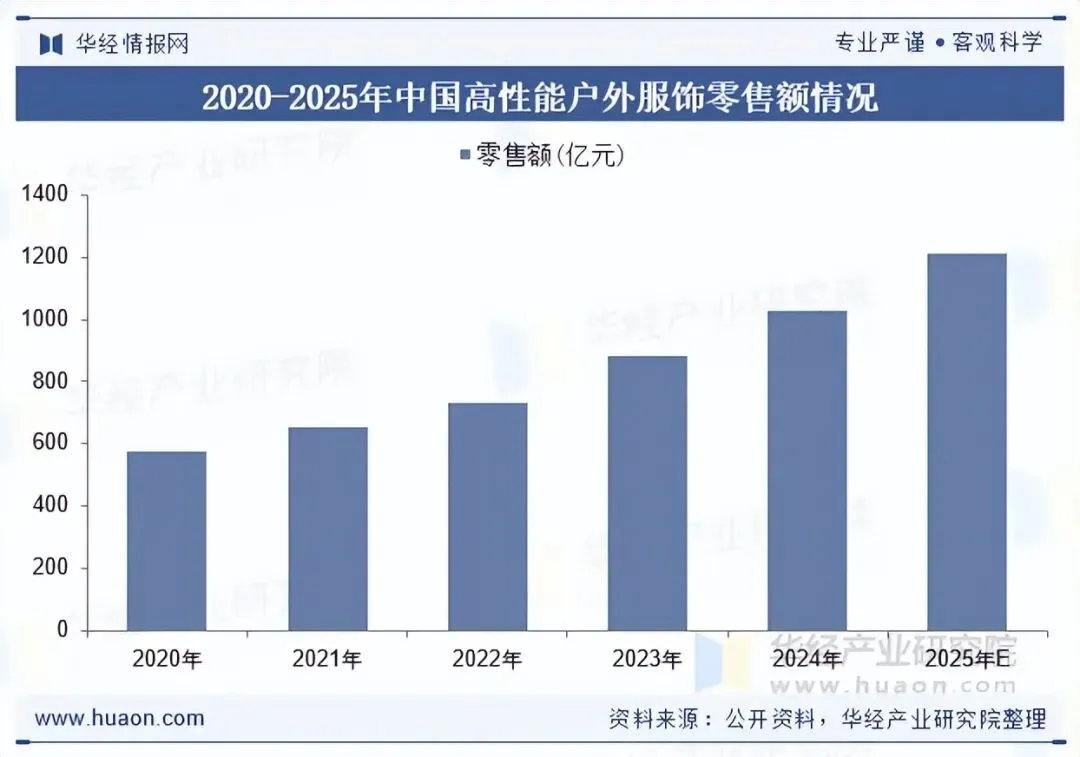 近年来,我国户外运动参与人数不断增加,越来越多的人开始参与登山、徒步及越野跑等户外活动,使得对具有功能性特点的软壳衣裤的市场需求持续增长,并且,消费者对积极生活方式的日益青睐,以及户外与休闲服饰界限的逐渐消弭,推动了对既可满足户外活动需求,亦适合日常穿着的多用途高性能户外服饰的需求增长。2024年,中国高性能户外服饰零售额约为1027亿元。