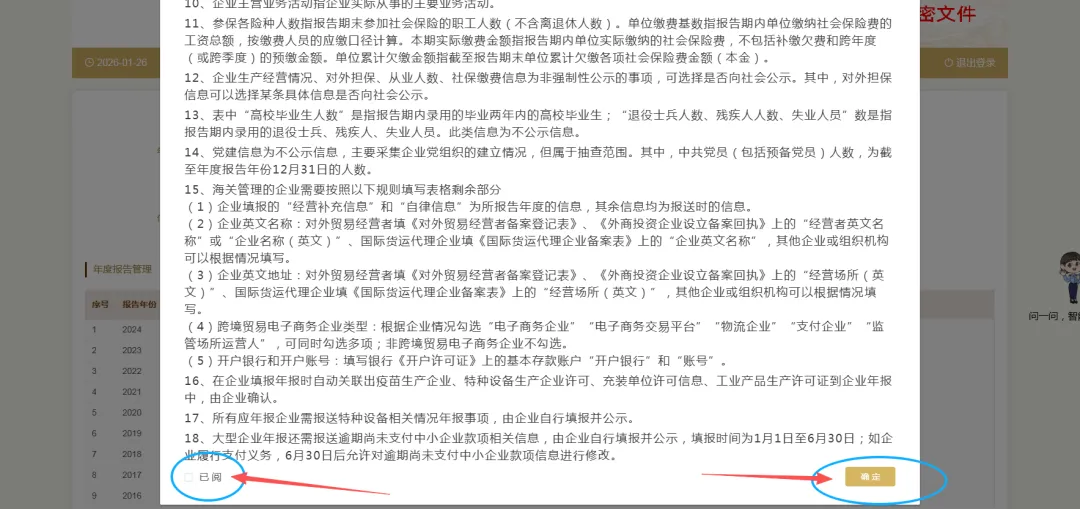 弹出年报须知,阅读后,在下方“已阅”前的小框内“∨”(对勾),再点确认。如果以前存在没有参加年报的年度,先需要将以前年度补报后才可申报本年度的。