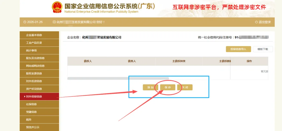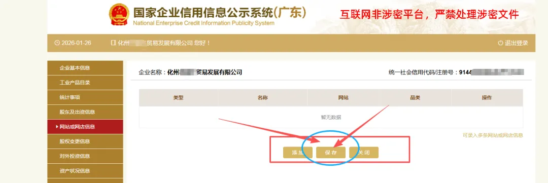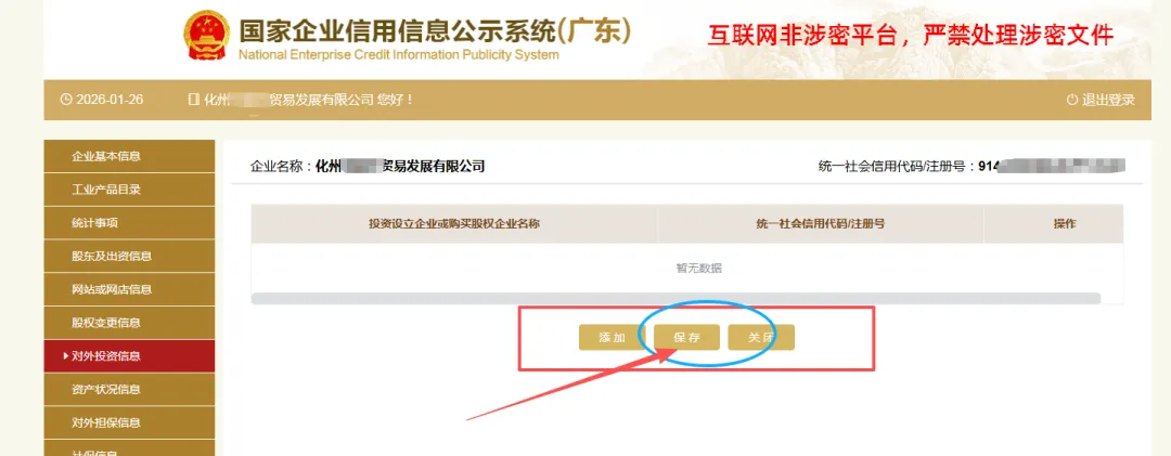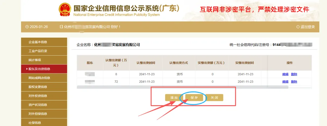 填写股东及出资信息,点击“添加”进行填写。(分公司无需填写)按照公司章程上约定的填写股东出资额及出资时间,每一个股东(发起人)的出资信息只需填报一条,股东(发起人)认缴和实缴出资额为截至报告年度12月31日的累计数额;认缴和实缴出资时间为截至报告年度12月31日最后一次认缴和实缴时间,出资方式可以多选。点击“保存”。