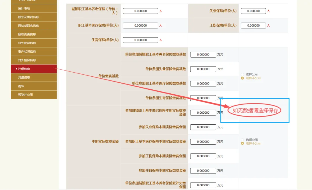 填写社保信息。参保各险种人数指报告期末参加社会保险的职工人数(不含离退休人数)。单位缴费基数指报告期内单位缴纳社会保险费的工资总额,按缴费人员的应缴口径计算。本期实际缴费金额指报告期内单位实际缴纳的社会保险费,不包括补缴欠费和跨年度(或跨季度)的预缴金额。单位累计欠缴金额指截至报告期末单位累计欠缴各项社会保险费金额(本金)。如还未缴纳社保,则在各处填写“0”。