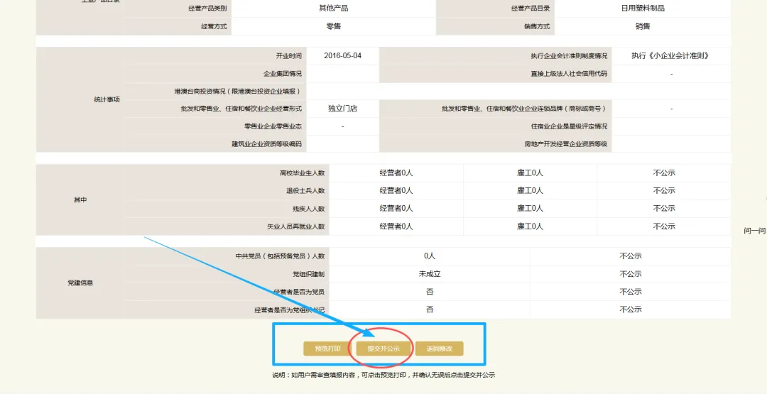 预览并公示。这是年报的最后一步,点击左边的“预览并公示”,检查所填写的所有信息,如果没有问题点击“提交并公示”,待出现“提交成功”的弹出窗口,点击确认,年报就完成了。年报内容填写准确、完整后务必点击最后“提交并公示”,否则不能完成年报。