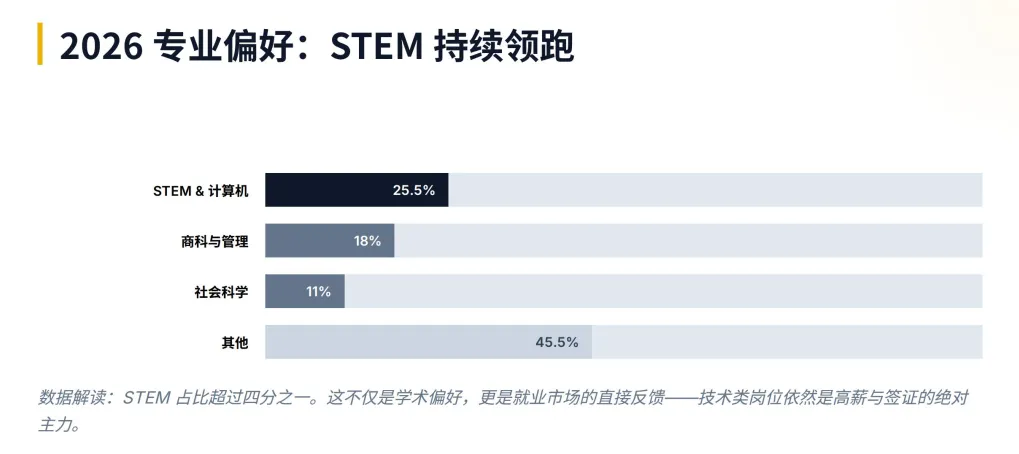 STEM(科学、技术、工程、数学)与计算机相关专业占比超过四分之一。这正是就业市场的直接反馈:技术类岗位依然是高薪与 H-1B 签证的绝对主力。