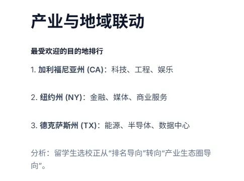 加州、纽约州、德克萨斯州成为最受青睐的目的地。这一排名与美国的科技、金融及能源产业布局展现出的趋势一致,证明 “哪里有产业,哪里就有留学生” 的择校逻辑正在不断深化。