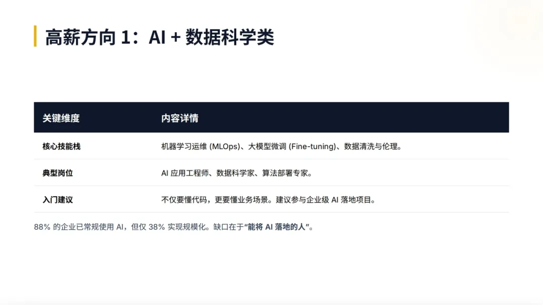 岗位逻辑:白皮书数据显示,88% 的企业已在业务中经常性使用 AI,但仅 38% 实现了规模化。巨大的缺口在于 “能将 AI 落地的人”。这一领域的岗位正从纯研发向 “应用与工程化” 转移。