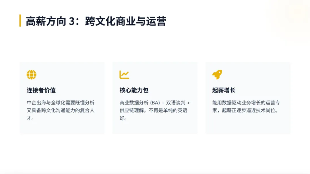 关键能力:不再只聚焦于英语能力,而是 “商业数据分析 (BA) + 双语谈判 + 供应链理解” 的综合体。能用数据驱动业务增长的运营专家,起薪逐步逼近技术岗。