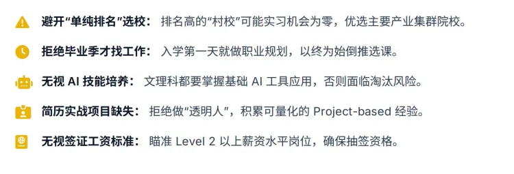 危害: 缺乏实战项目,文书空洞无物。建议: 积累可量化、有成果的真实项目经验(Project-based Learning)。