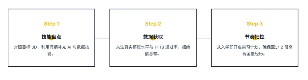 节奏把控: 建立从大一/研一开启的实习时间表,确保毕业前至少有 2 段高含金量实习。